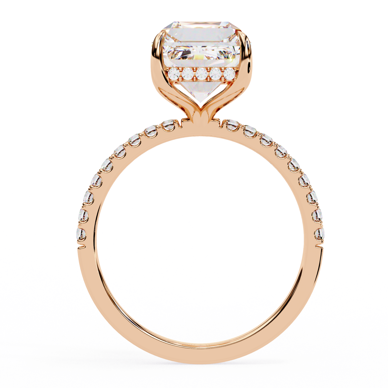 The band is beautifully designed in warm 14K/18K rose gold, delicately adorned with a row of sparkling pavé-set diamonds, adding extra shimmer and sophistication. This ring blends modern luxury with classic refinement, making it the perfect symbol of everlasting love.