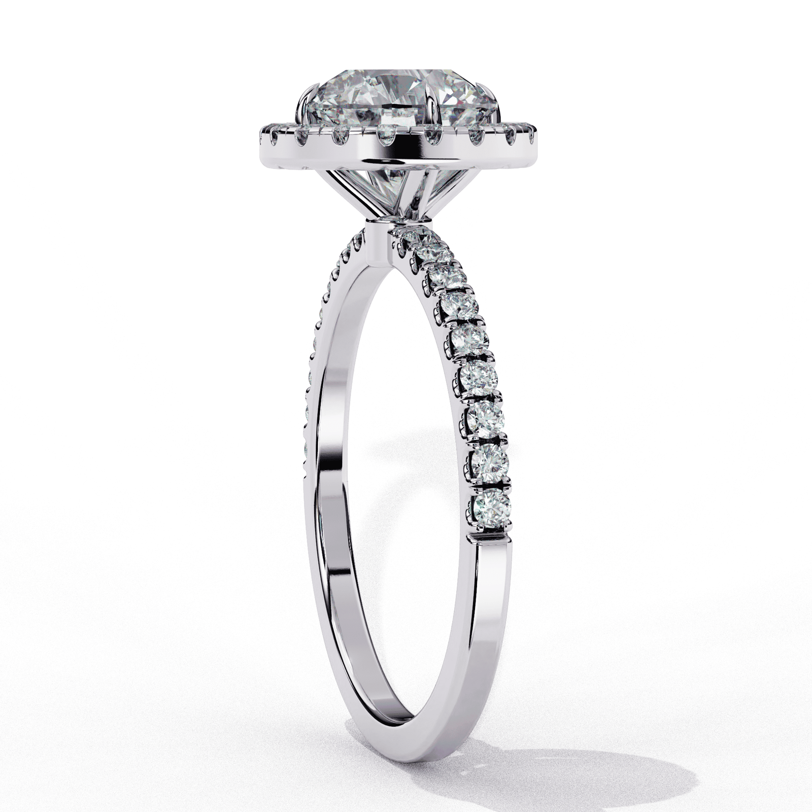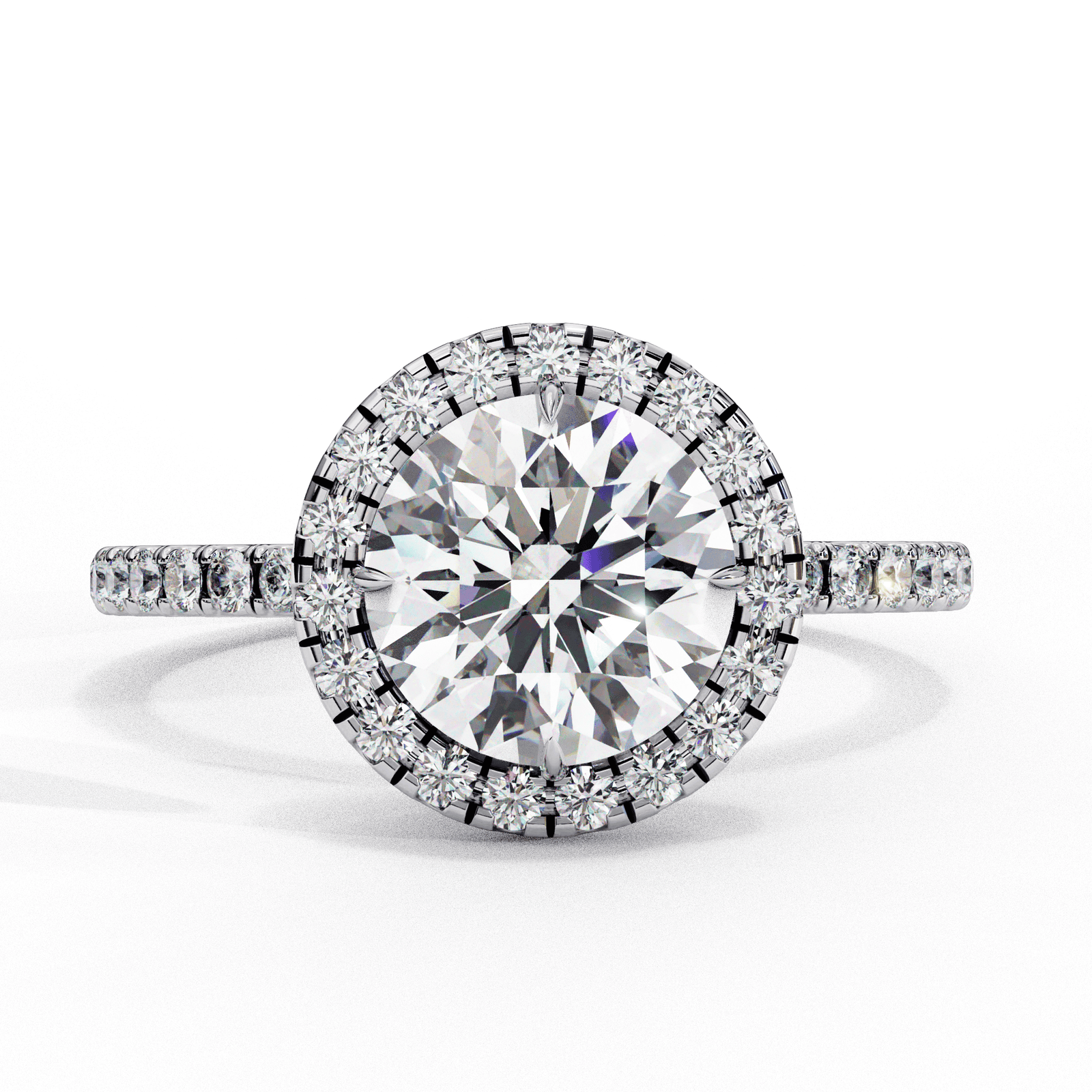 This elegant engagement ring showcases a brilliant round-cut center diamond, beautifully encircled by a shimmering halo of smaller round diamonds. The band is intricately set with additional diamonds, adding brilliance and sophistication to the design. Crafted in luxurious white gold or platinum, this ring offers a timeless, classic look with a touch of modern elegance, making it perfect for your special moment.