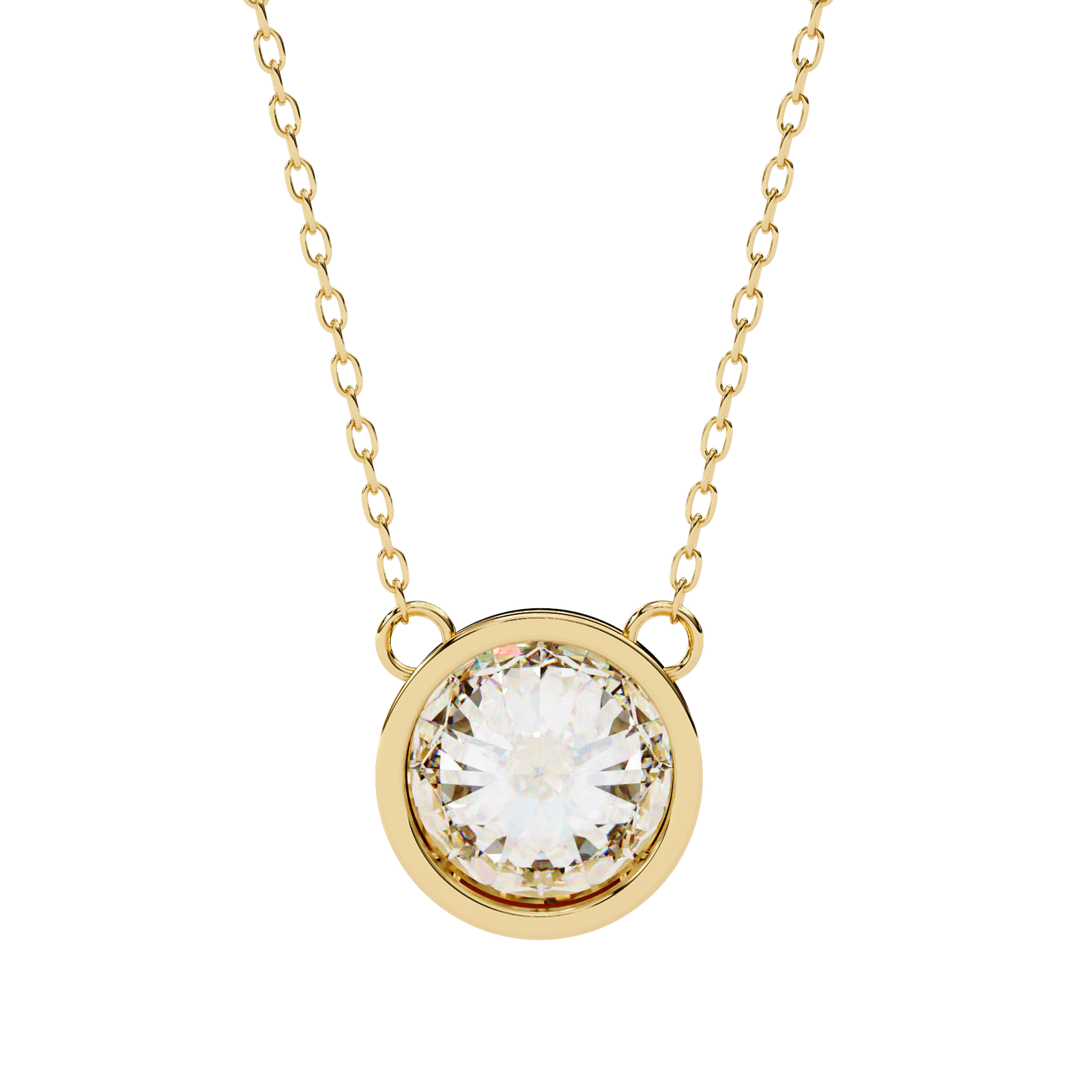 Add effortless elegance to your jewelry collection with this classic round diamond bezel pendant necklace. Featuring a brilliant round-cut diamond encased in a sleek bezel setting, this pendant radiates timeless beauty while offering a modern, minimal look. Suspended on a delicate chain, it’s the perfect piece for everyday sophistication or layering with other necklaces.