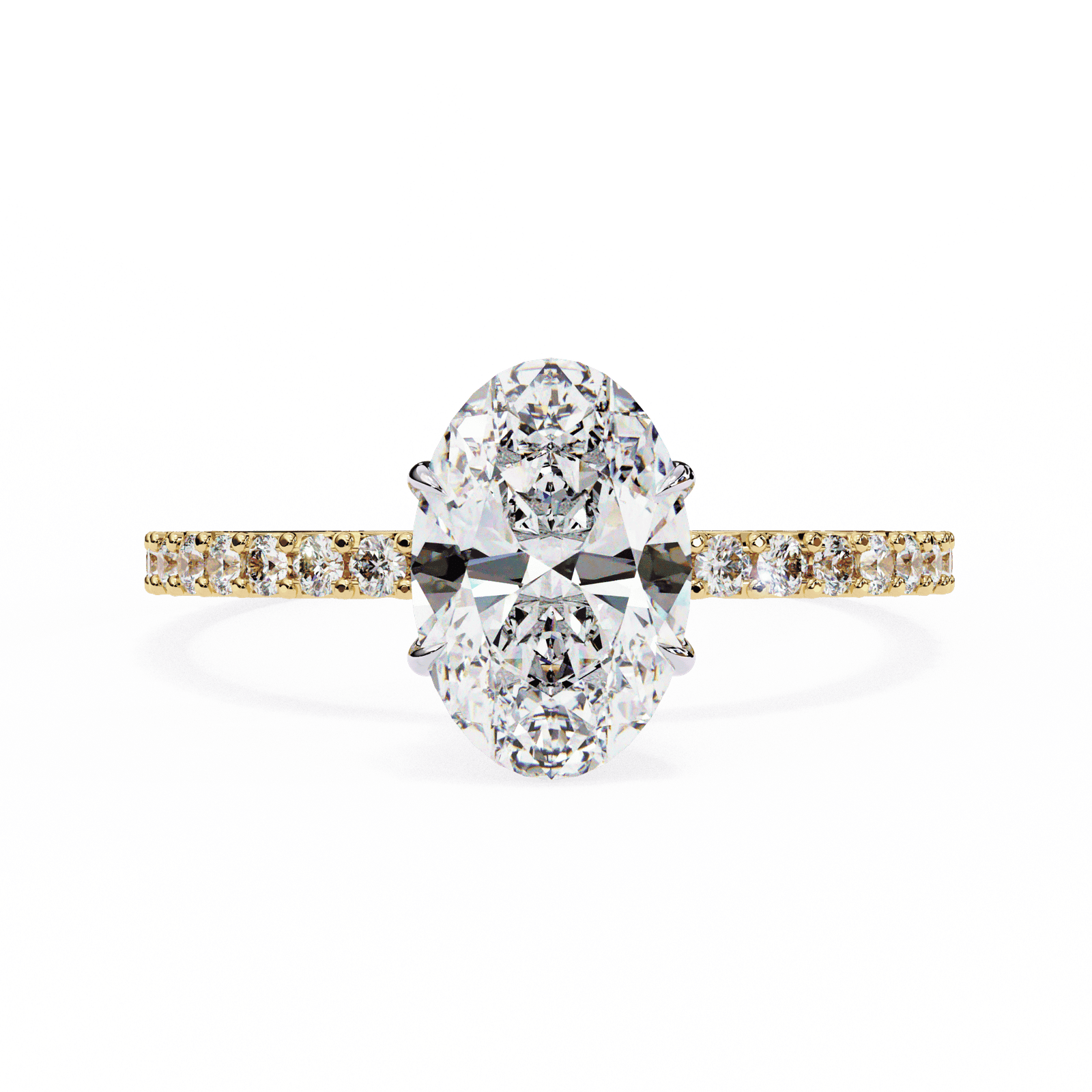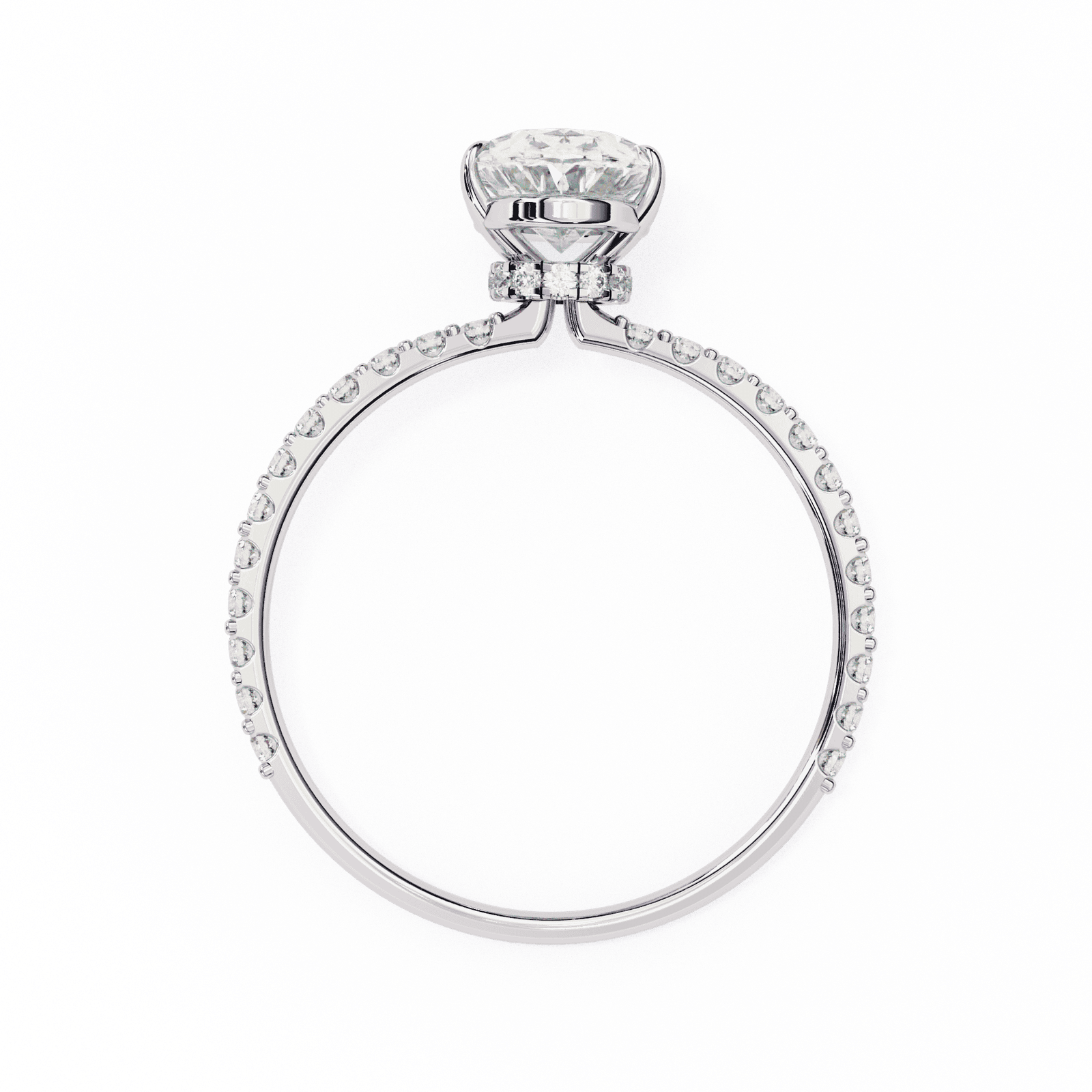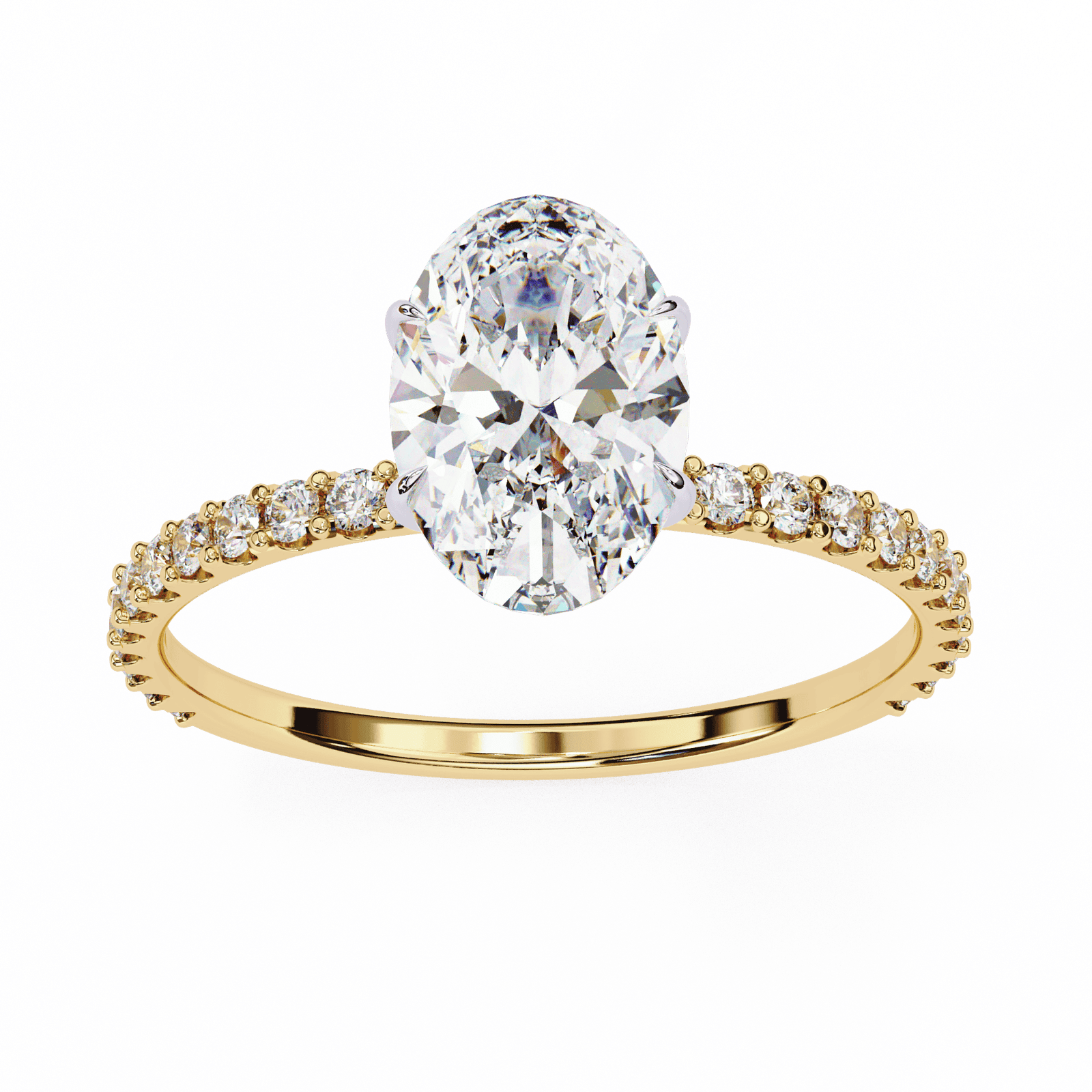 This elegant engagement ring highlights a radiant oval-cut diamond, celebrated for its brilliant sparkle and elongated shape that flatters the finger. The center stone is secured in a refined prong setting, while the band is adorned with delicate pav?-set diamonds that add a touch of continuous shimmer. Crafted in platinum or white gold, this design combines classic beauty with modern allure, making it the perfect choice for those who seek timeless romance with extra brilliance.