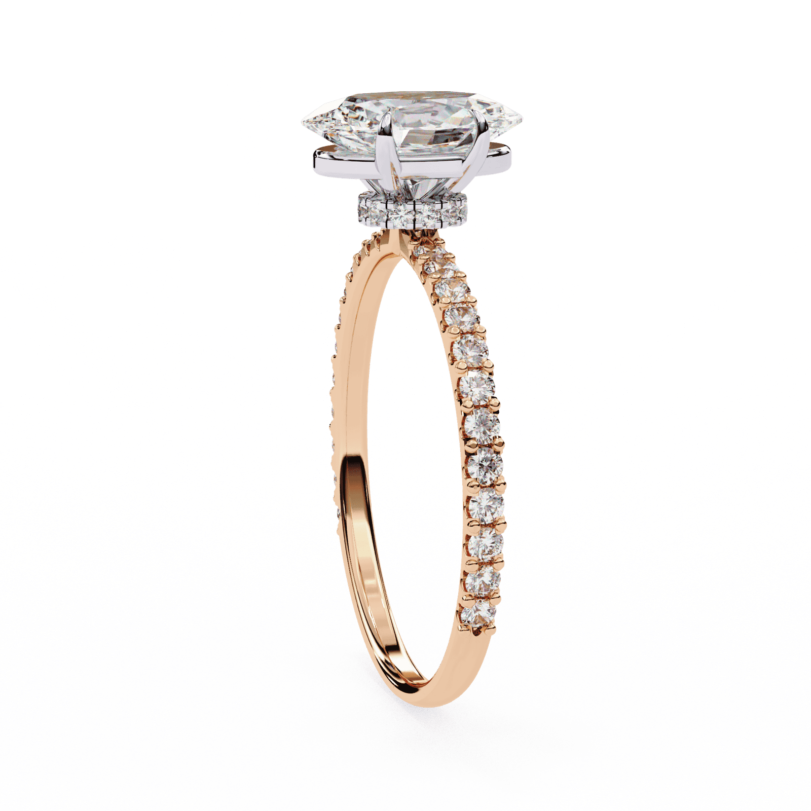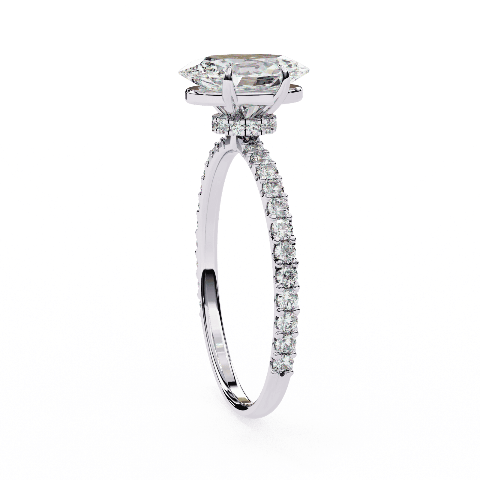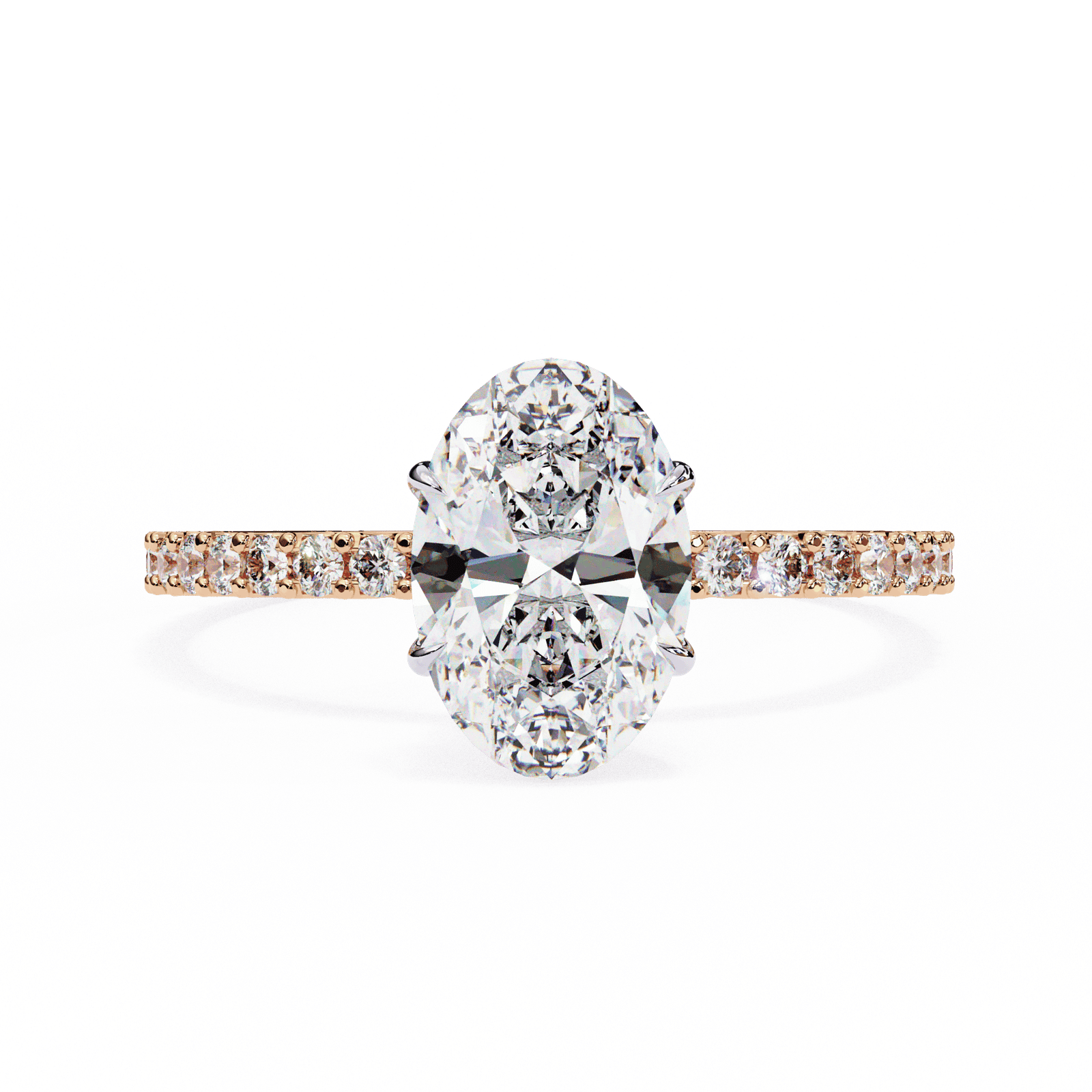 This elegant engagement ring highlights a radiant oval-cut diamond, celebrated for its brilliant sparkle and elongated shape that flatters the finger. The center stone is secured in a refined prong setting, while the band is adorned with delicate pav?-set diamonds that add a touch of continuous shimmer. Crafted in platinum or white gold, this design combines classic beauty with modern allure, making it the perfect choice for those who seek timeless romance with extra brilliance.