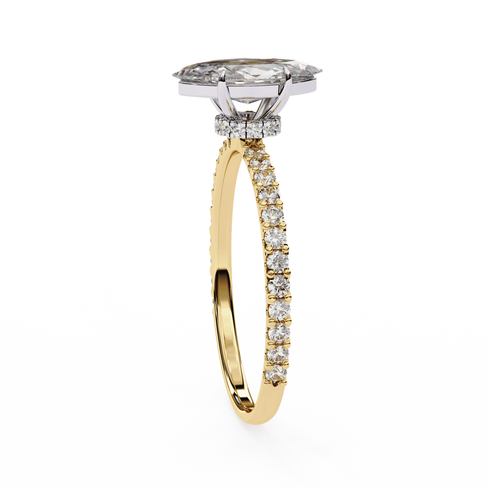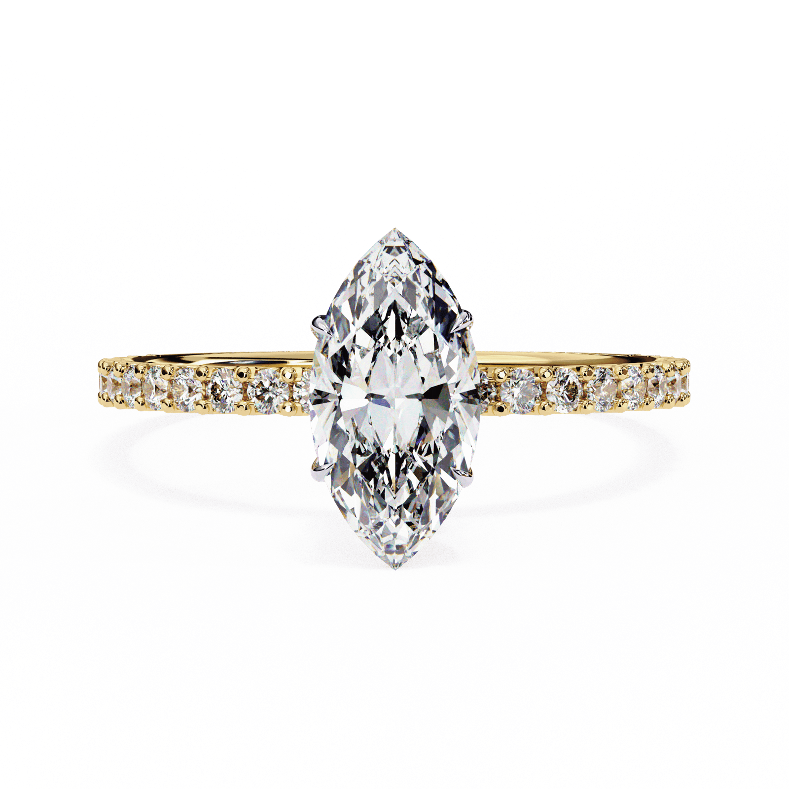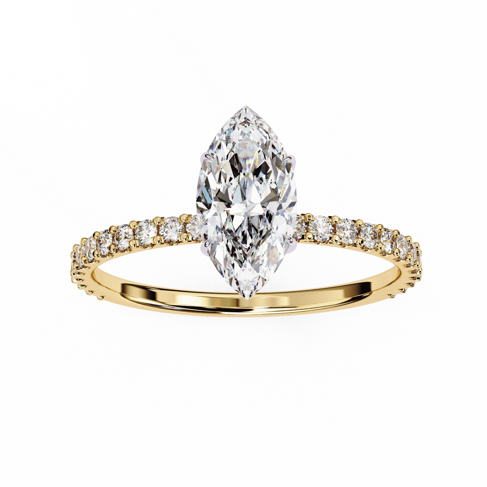 This stunning engagement ring showcases a brilliant marquise-cut diamond, admired for its elongated shape and graceful curves that create the illusion of a larger stone. The centerpiece is elegantly set in a secure prong setting, complemented by a delicate pav? band lined with sparkling accent diamonds. Crafted in platinum or white gold, this ring combines timeless romance with modern sophistication, making it an ideal choice for those who desire a bold yet elegant statement of love.