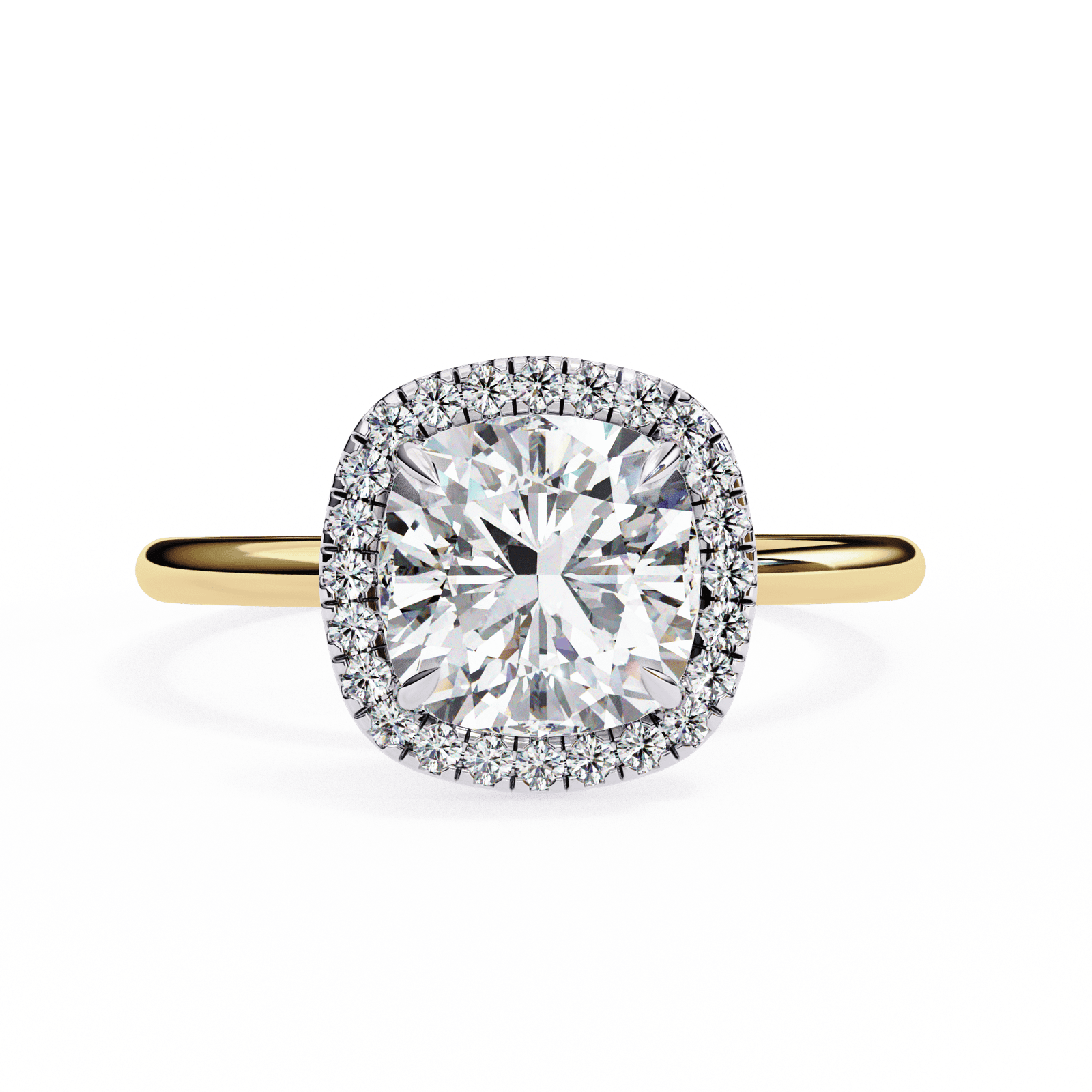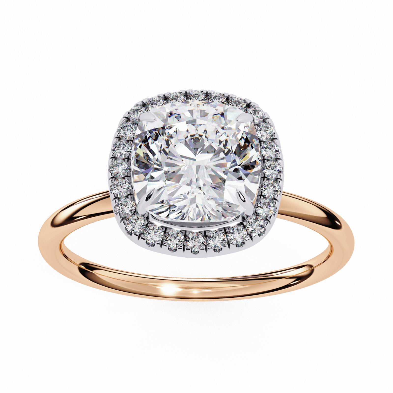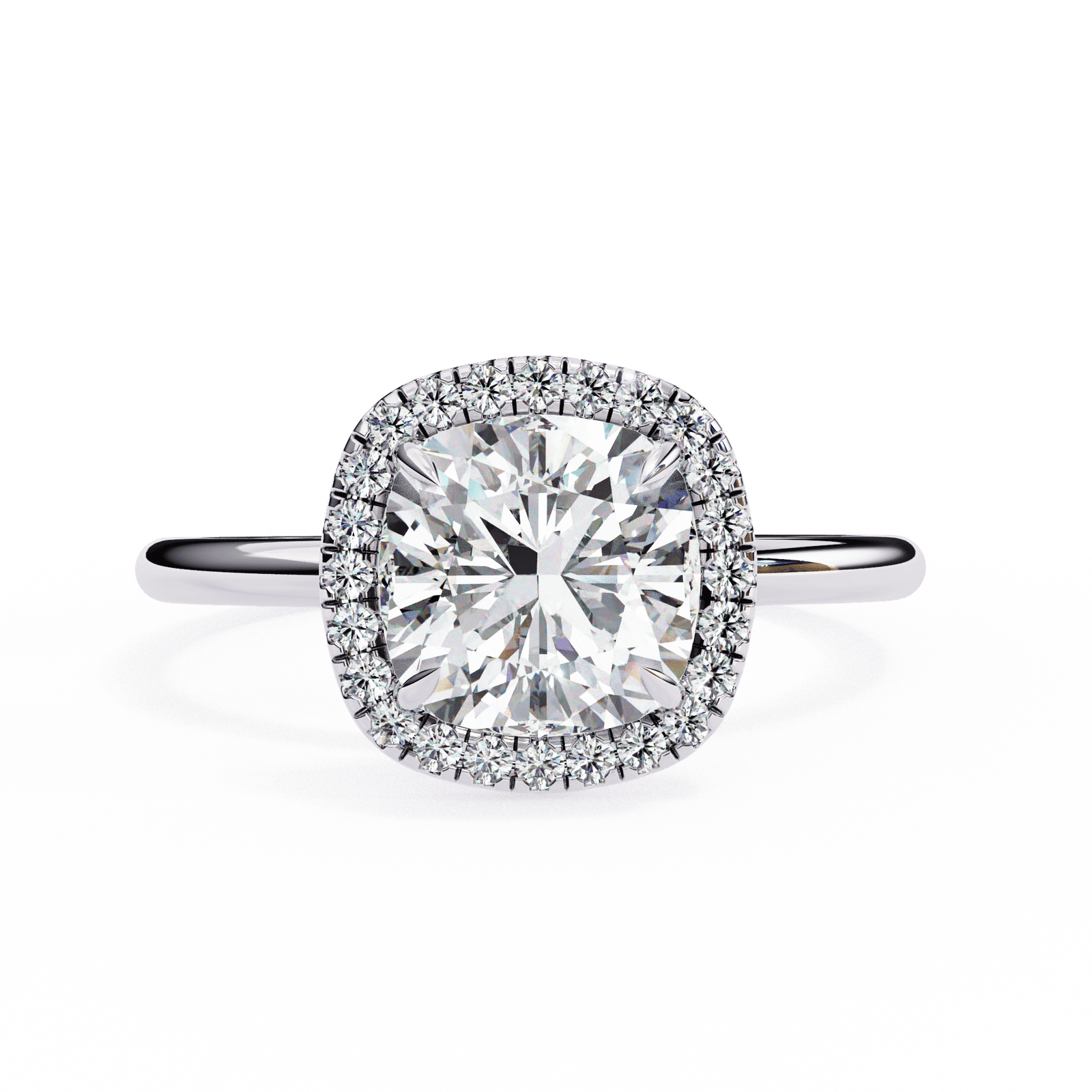 This radiant engagement ring features a cushion-cut diamond encircled by a shimmering halo of pav?-set diamonds, enhancing the center stone?s brilliance and fire. The cushion shape?s soft curves and square silhouette exude timeless romance, while the slim polished band ensures all attention stays on the dazzling centerpiece. Crafted in platinum or white gold, this design blends vintage-inspired elegance with modern sophistication, making it a captivating symbol of everlasting love.