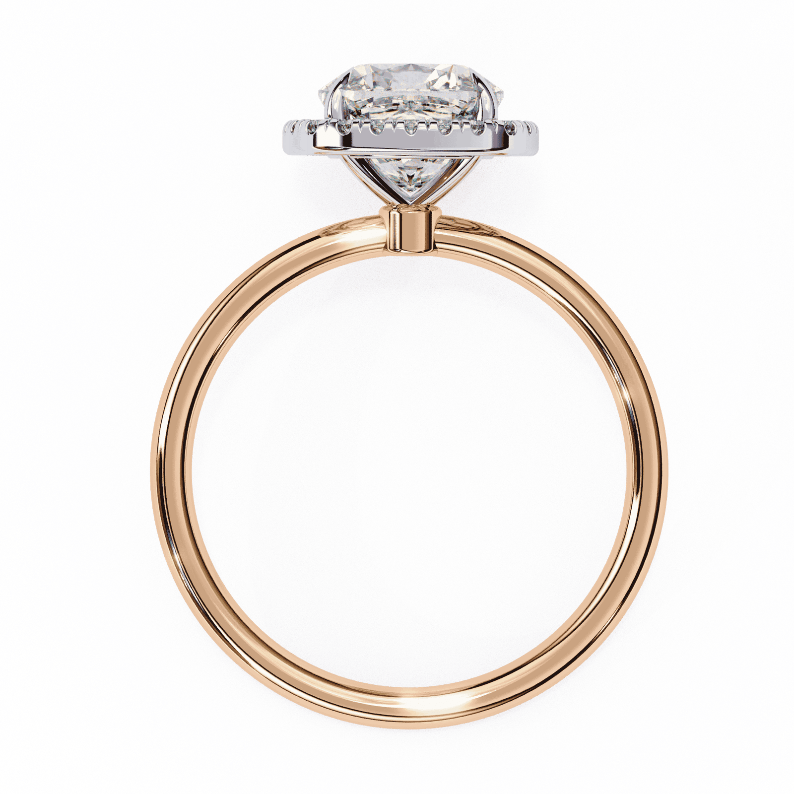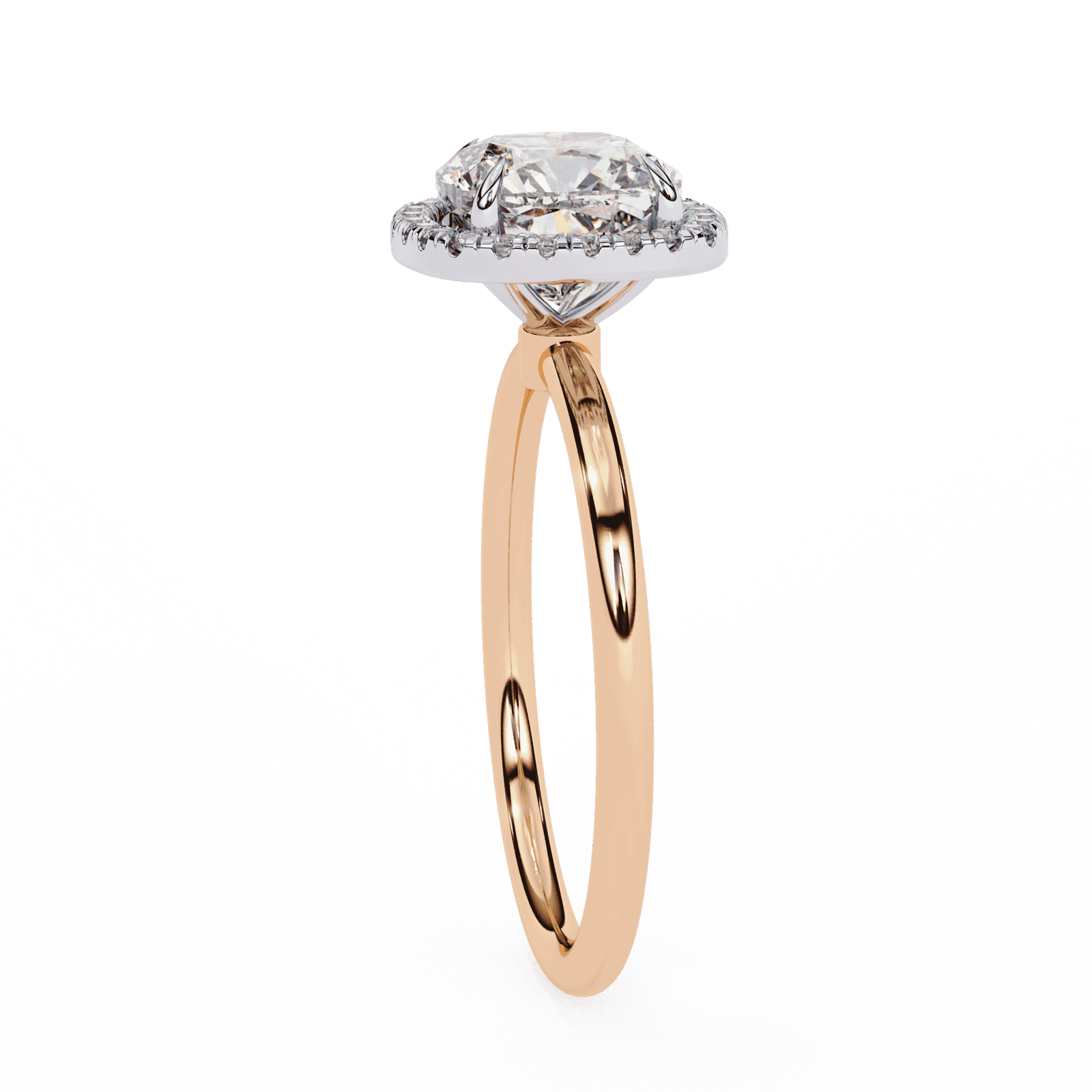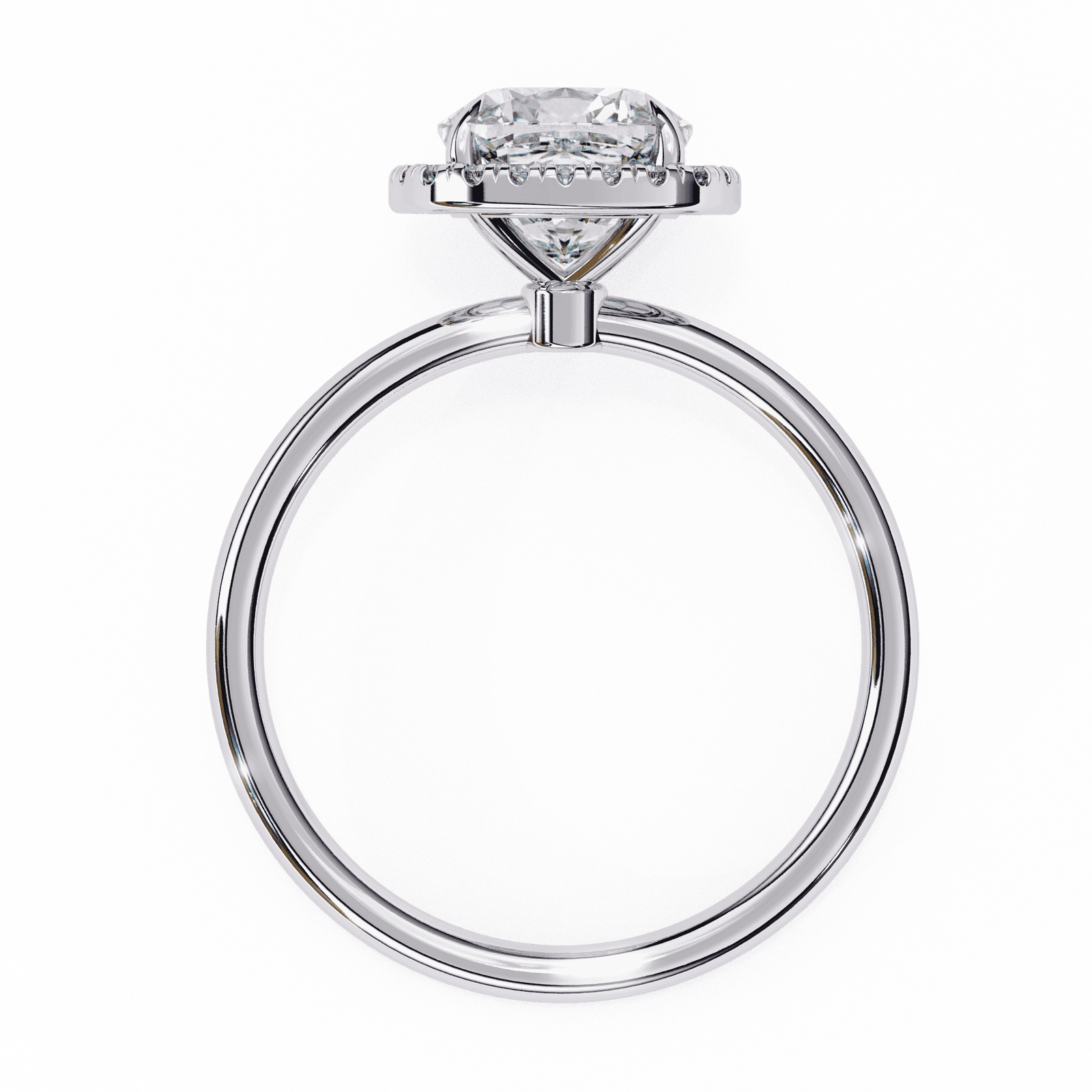 This radiant engagement ring features a cushion-cut diamond encircled by a shimmering halo of pav?-set diamonds, enhancing the center stone?s brilliance and fire. The cushion shape?s soft curves and square silhouette exude timeless romance, while the slim polished band ensures all attention stays on the dazzling centerpiece. Crafted in platinum or white gold, this design blends vintage-inspired elegance with modern sophistication, making it a captivating symbol of everlasting love.