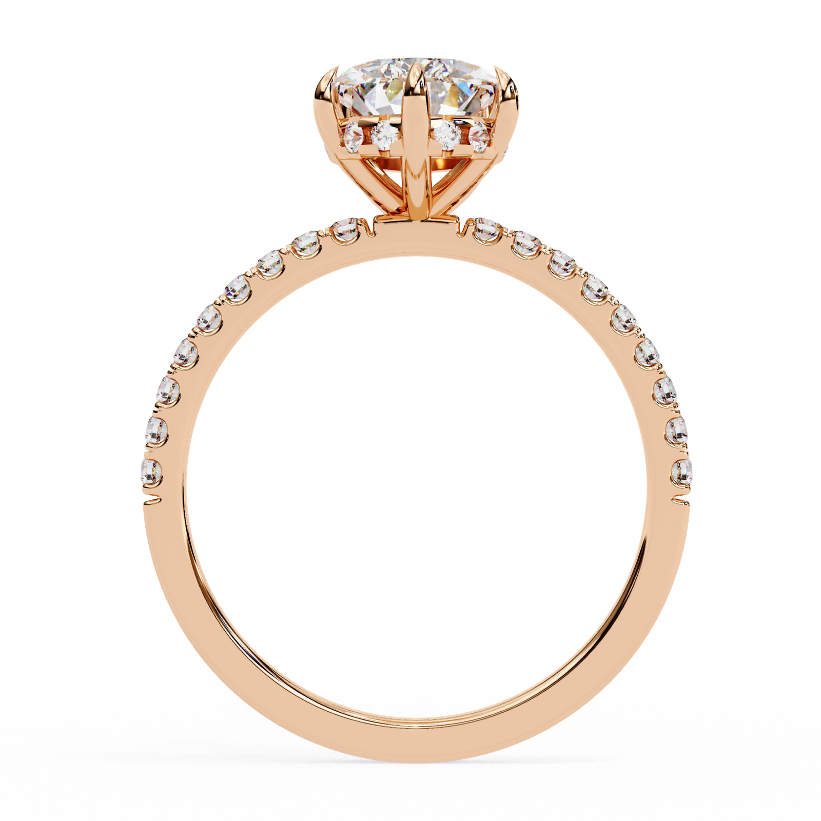 This enchanting engagement ring features a dazzling pear-cut diamond, blending the brilliance of a round cut with the elegance of a marquise shape. Set in a secure five-prong setting, the center stone radiates light beautifully with its unique teardrop silhouette. The refined band is adorned with pavé-set diamonds, adding a continuous sparkle that enhances the ring’s graceful design. Crafted in polished white gold (or platinum), this romantic piece is a perfect choice for a love that’s both timeless and unique.