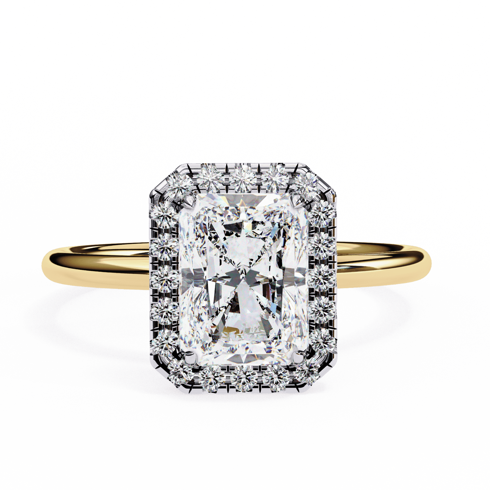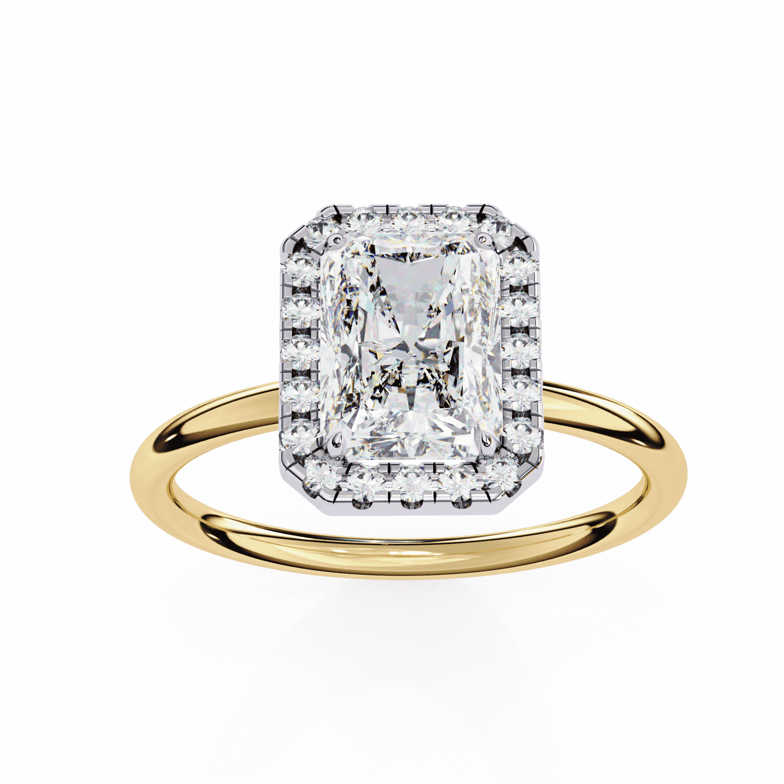 This elegant engagement ring features a radiant-cut diamond, admired for its brilliant sparkle and beveled corners that blend the glamour of round brilliance with the sophistication of emerald lines. The center stone is framed by a glittering halo of pav?-set diamonds, amplifying its fire and creating a bold, luxurious look. Set on a polished platinum or white gold band, this design embodies timeless elegance with a modern edge, making it a striking symbol of everlasting love.