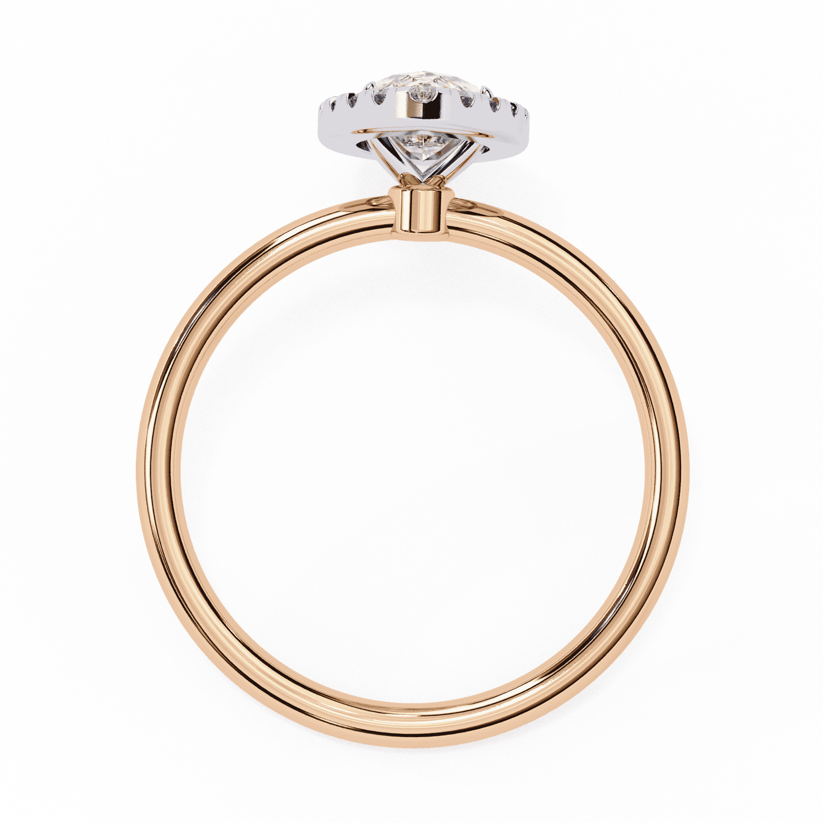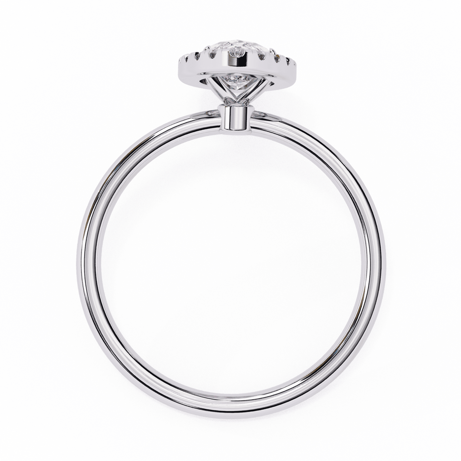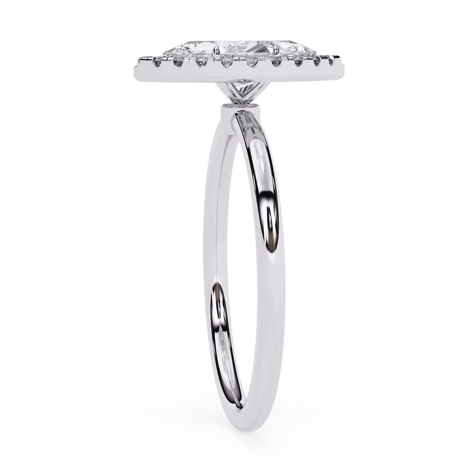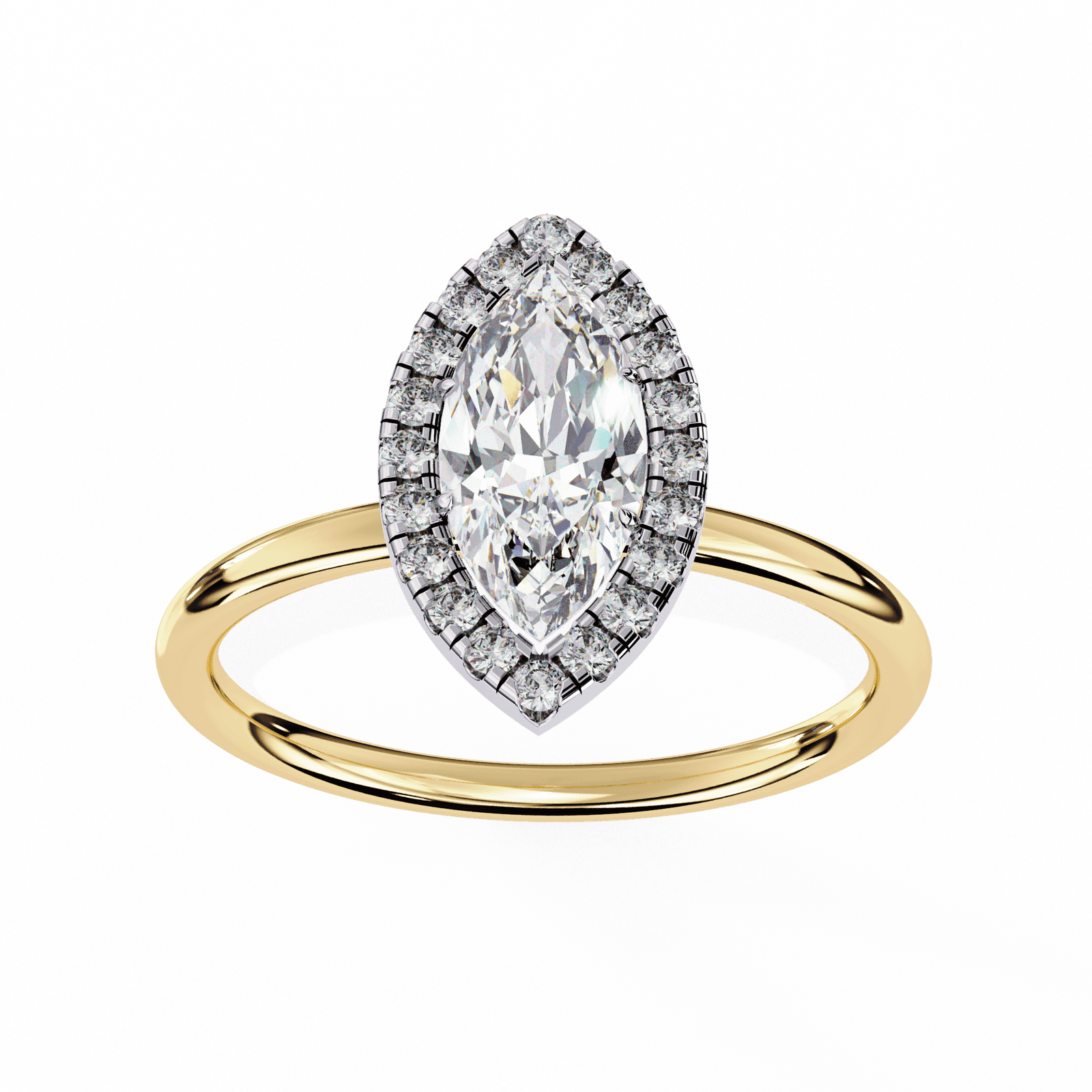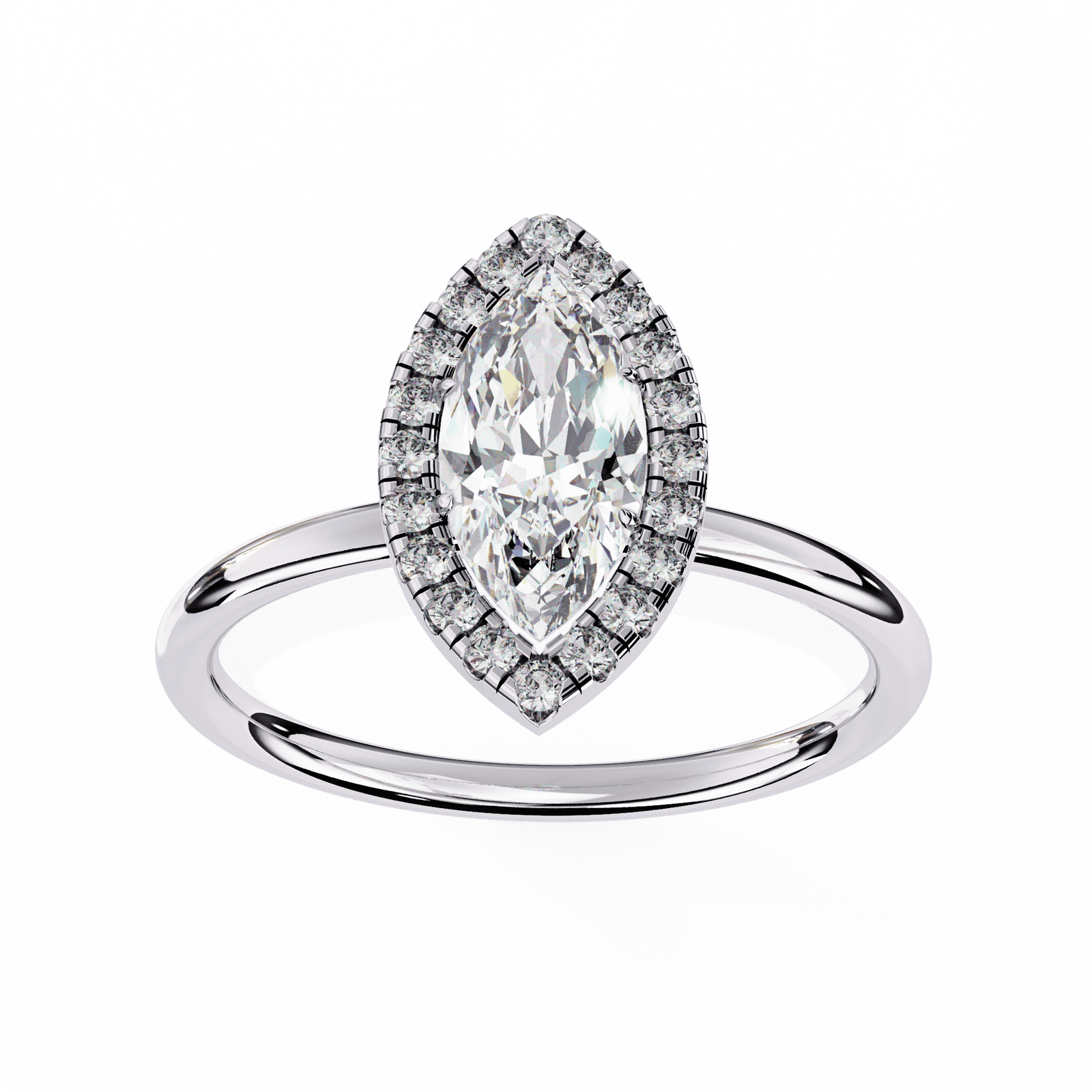 This exquisite engagement ring showcases a marquise-cut diamond, celebrated for its elongated, graceful shape that creates the illusion of length and elegance on the finger. Encircled by a halo of brilliant pav?-set diamonds, the center stone radiates brilliance from every angle, while the sleek and polished platinum or white gold band ensures timeless sophistication. Perfect for those who love a distinctive, regal look, this design symbolizes romance, individuality, and everlasting beauty.
