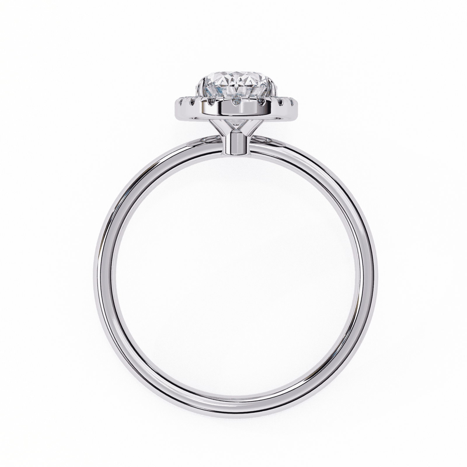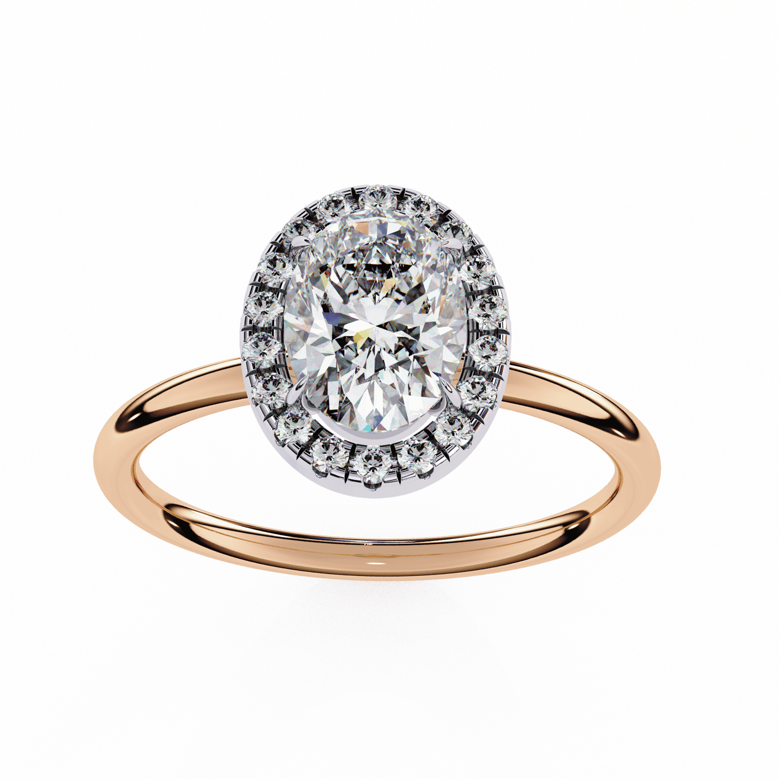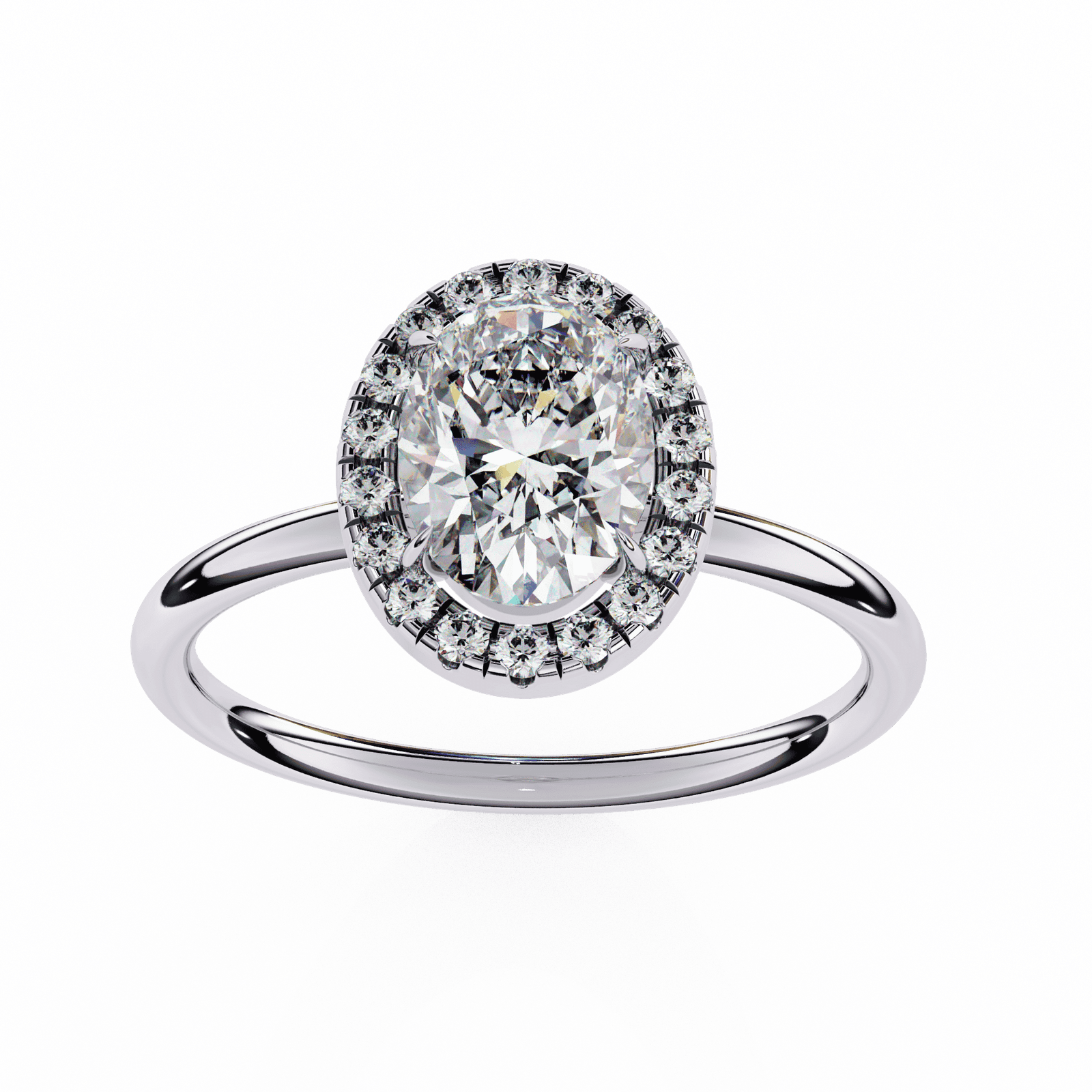 Timeless elegance meets modern brilliance in this oval-cut diamond halo engagement ring. The elongated oval center stone, beloved for its graceful symmetry and flattering shape, is encircled by a radiant halo of pav?-set diamonds that amplify its sparkle. Set upon a sleek and polished platinum or white gold band, this design exudes sophistication while offering a touch of contemporary charm. Perfect for those who seek both tradition and distinction, this ring symbolizes enduring love and refined beauty.