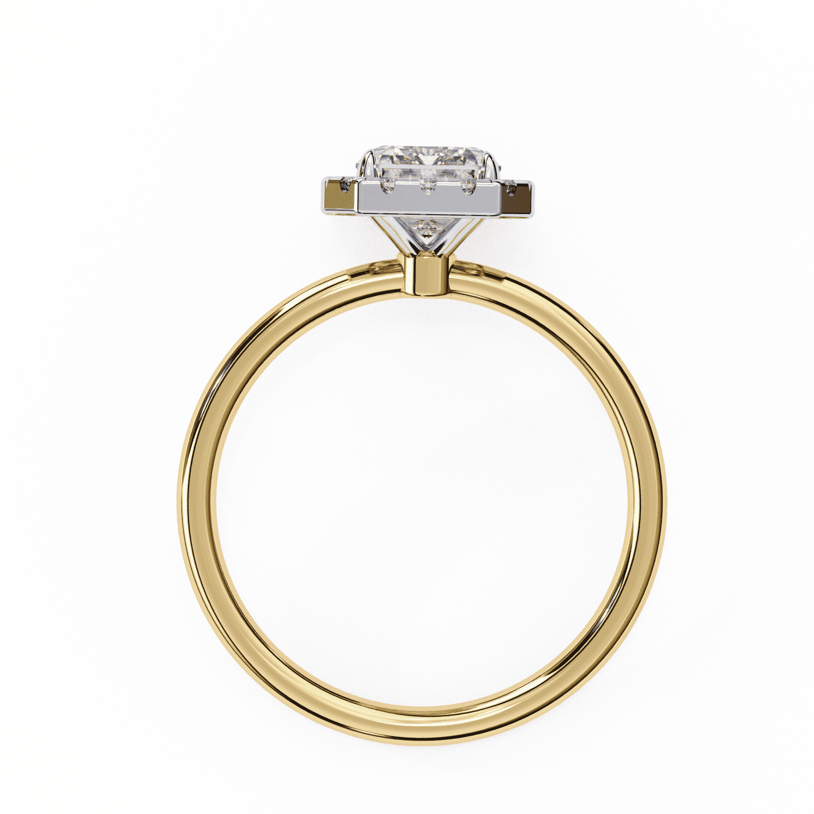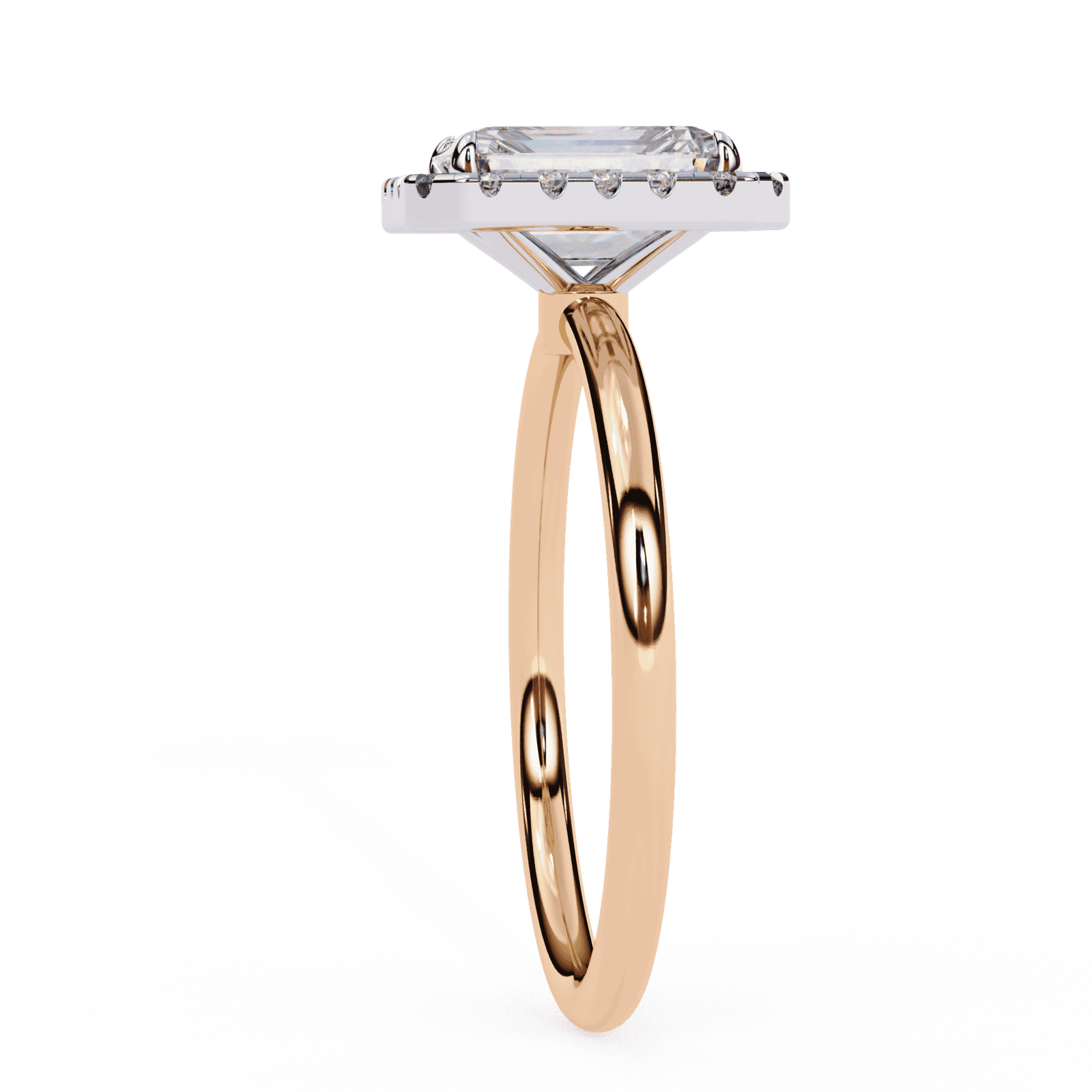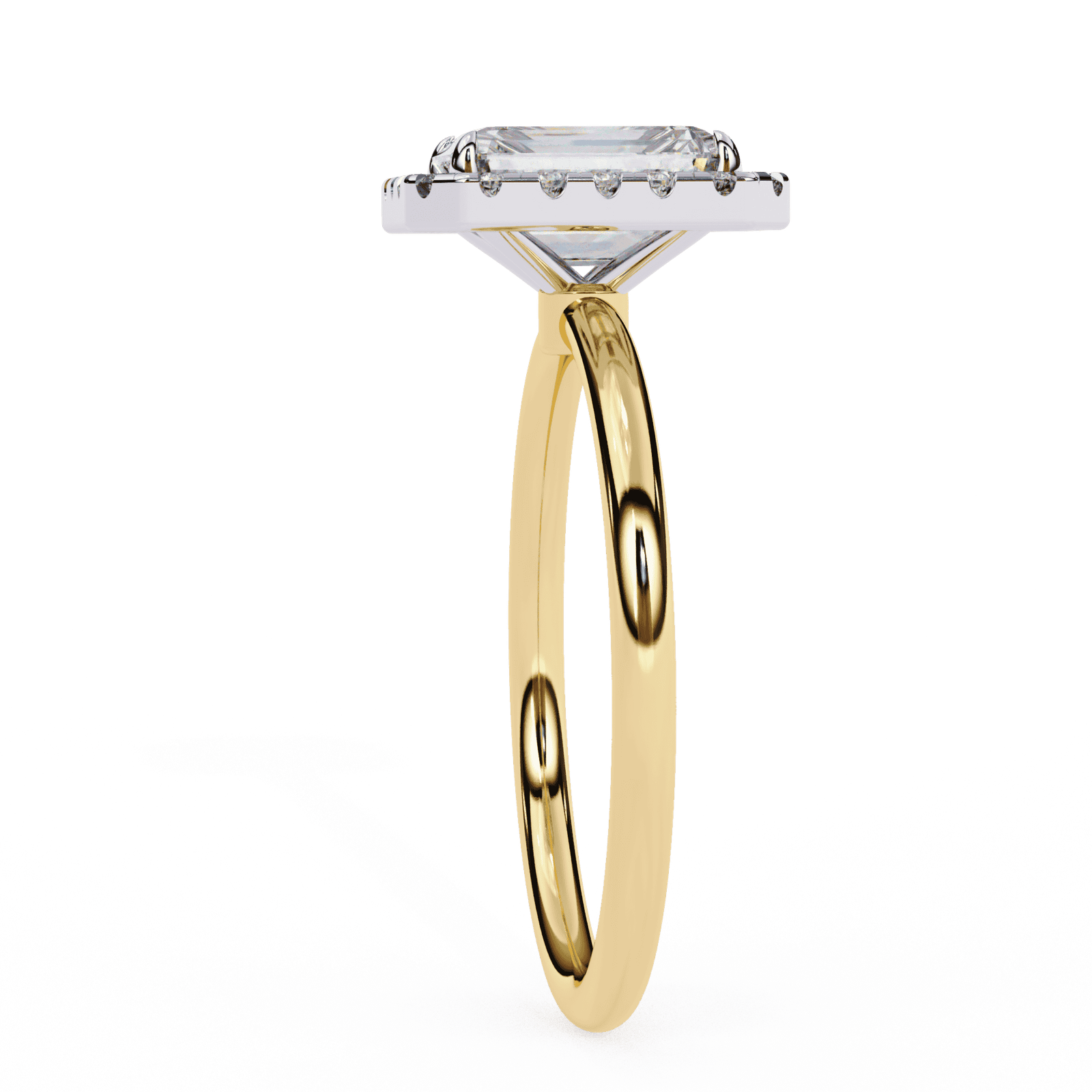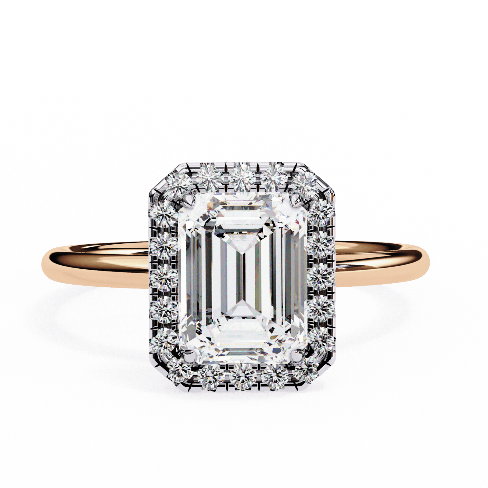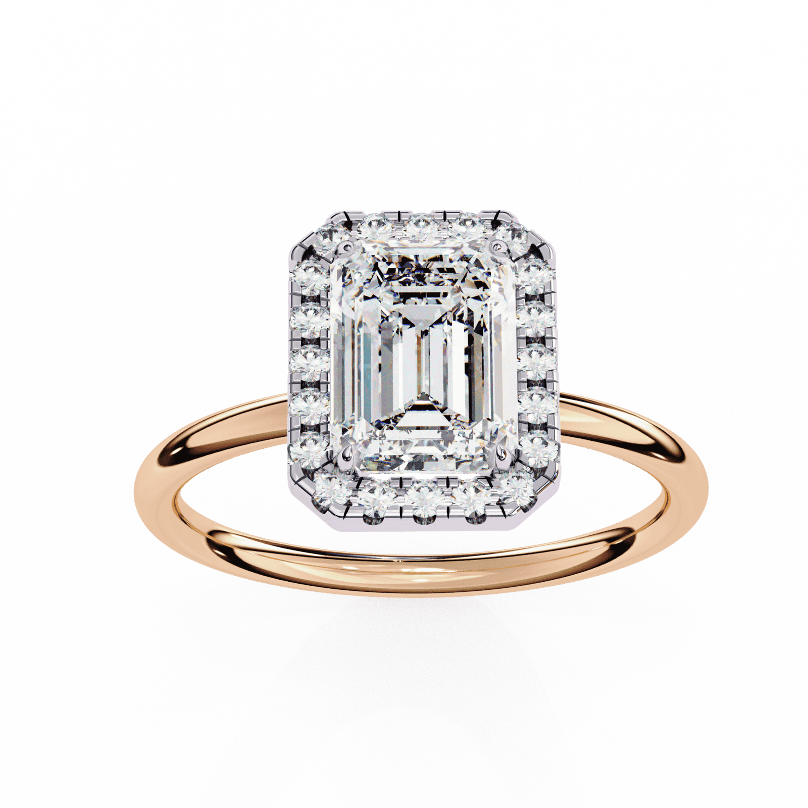 Sophisticated and timeless, this emerald-cut diamond halo engagement ring embodies understated luxury. The step-cut facets of the center emerald diamond create a hall-of-mirrors effect, radiating elegance with every glance. Surrounding the centerpiece, a halo of brilliant round diamonds enhances the clean lines of the cut, adding fire and brilliance to its subtle glow. The sleek, polished band provides a refined finish, making this ring perfect for those who appreciate grace, precision, and classic beauty.