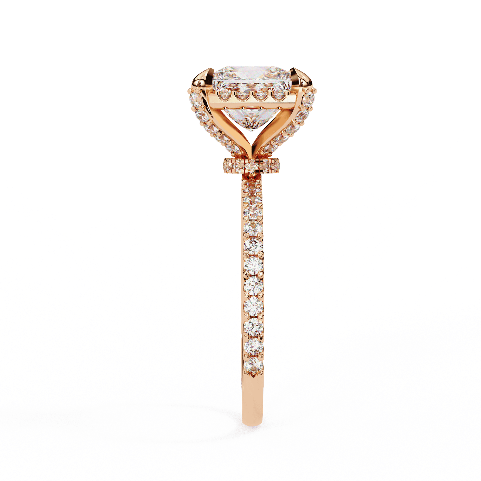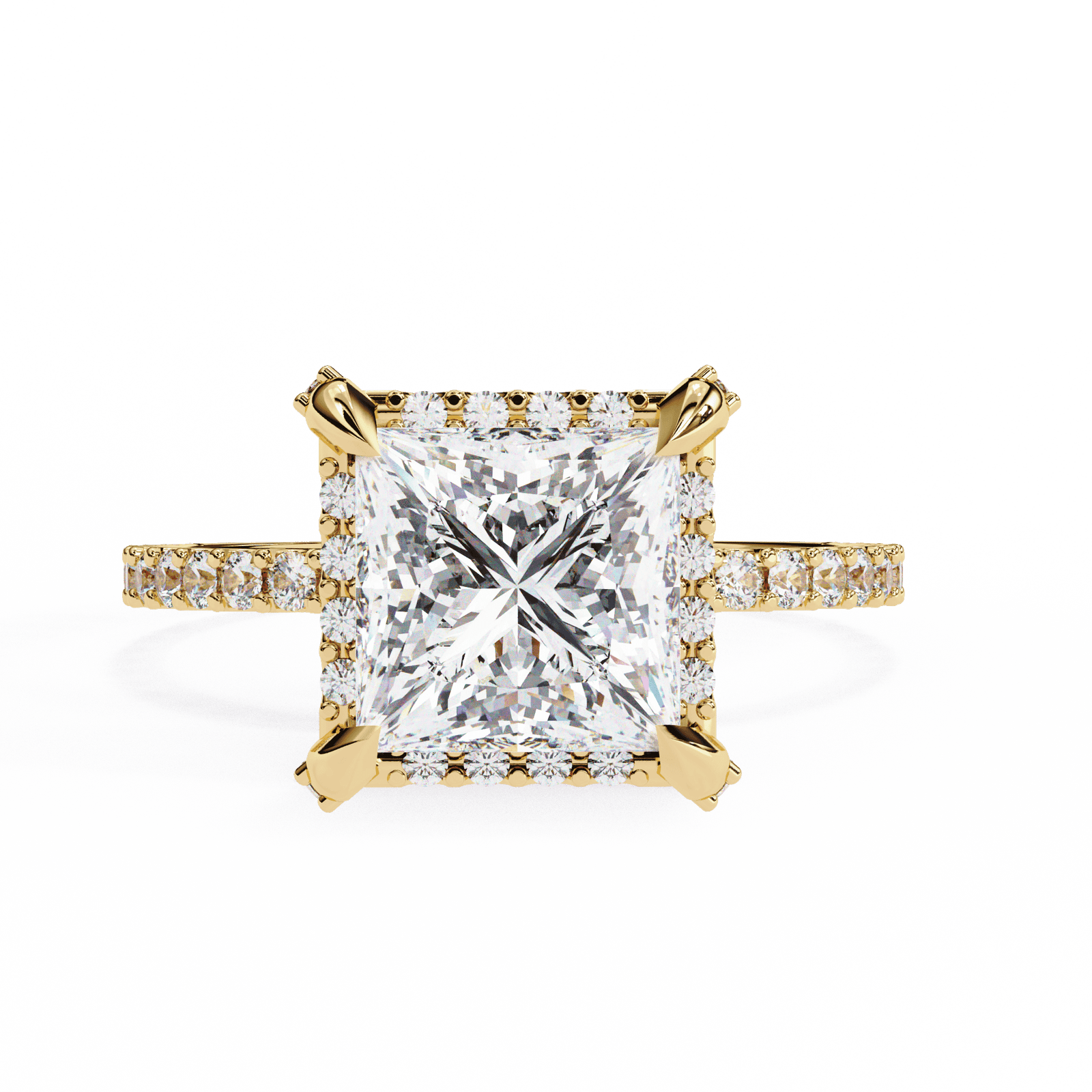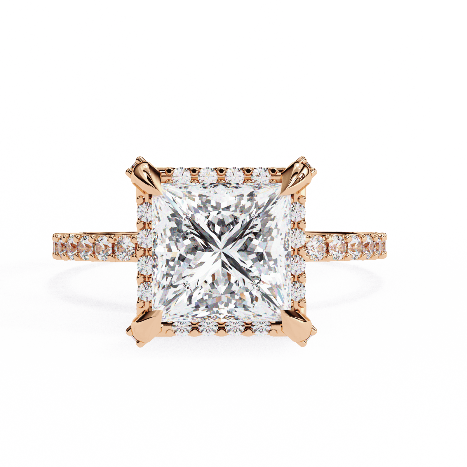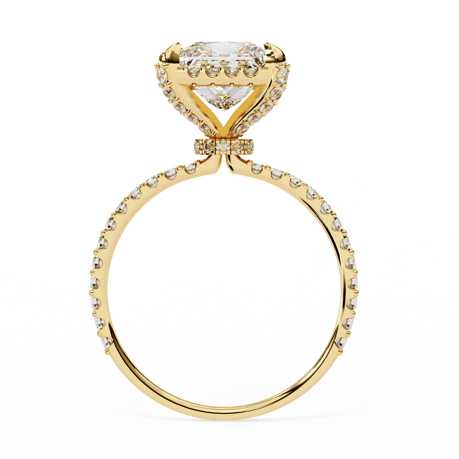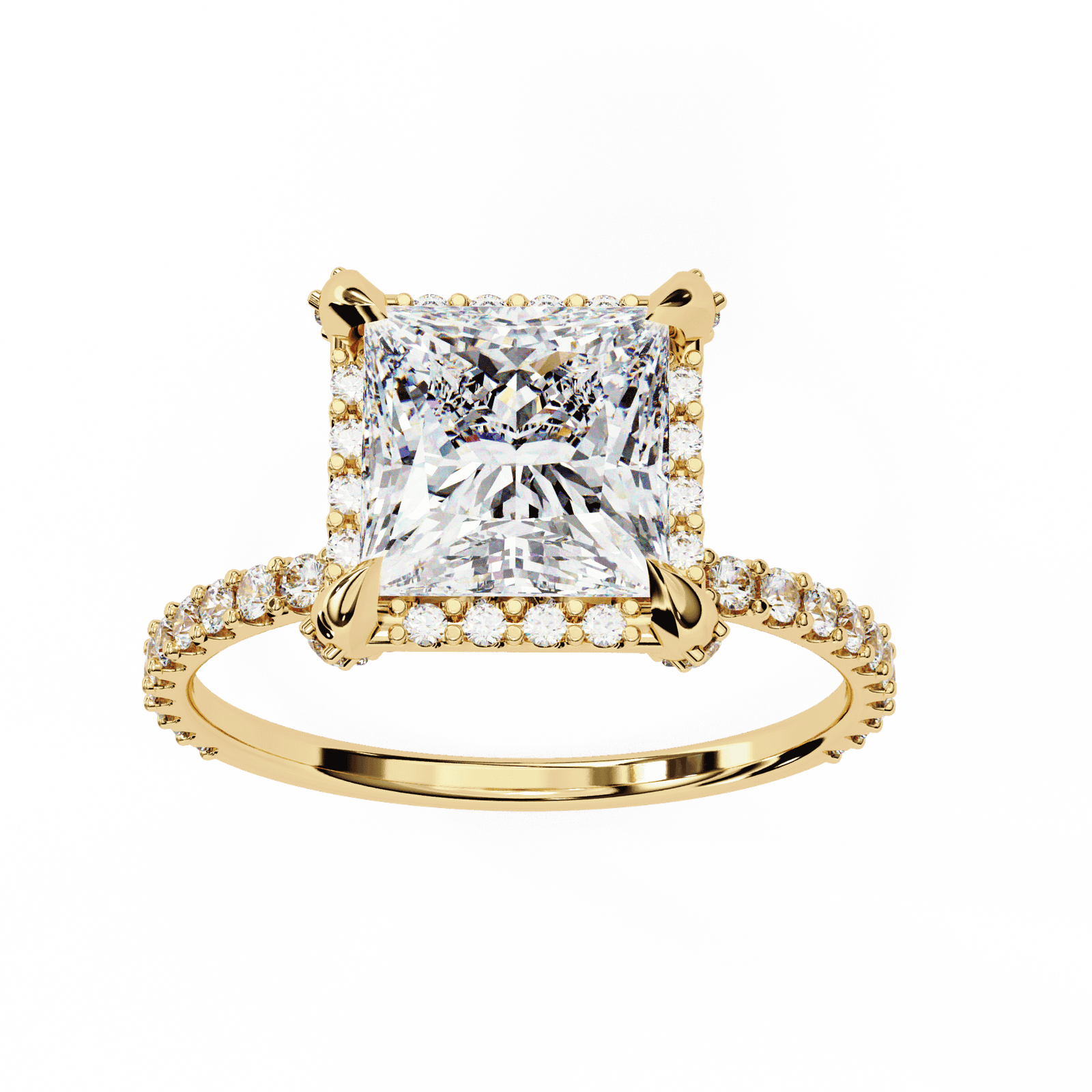 Modern elegance meets timeless sparkle in this stunning design. Featuring a princess-cut diamond set in a classic four-prong setting, the centerpiece is elevated to capture light from every angle. The band is adorned with a delicate Pave of round diamonds, adding an extra layer of brilliance and sophistication. Perfect for those who desire a romantic yet contemporary engagement ring, this design balances bold geometry with radiant fire.