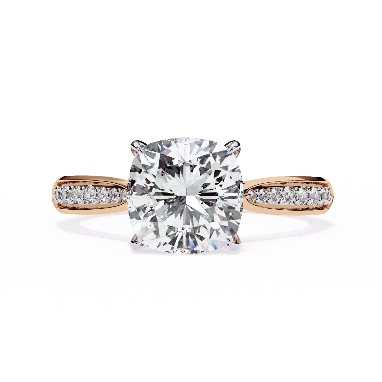 This timeless design features a dazzling cushion-cut diamond set in a classic four-prong setting. The split shank band is elegantly adorned with Pave-set diamonds, adding brilliance and depth to the design. A sophisticated balance of vintage charm and modern refinement.