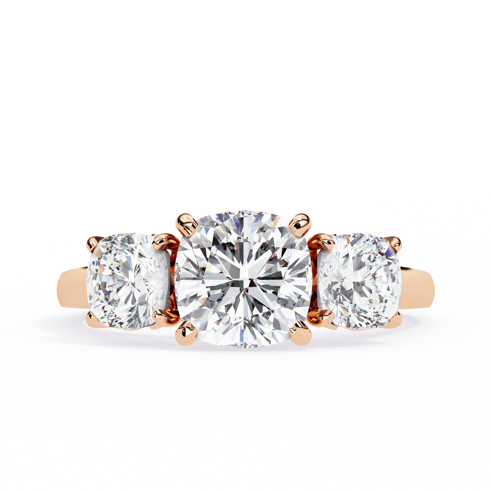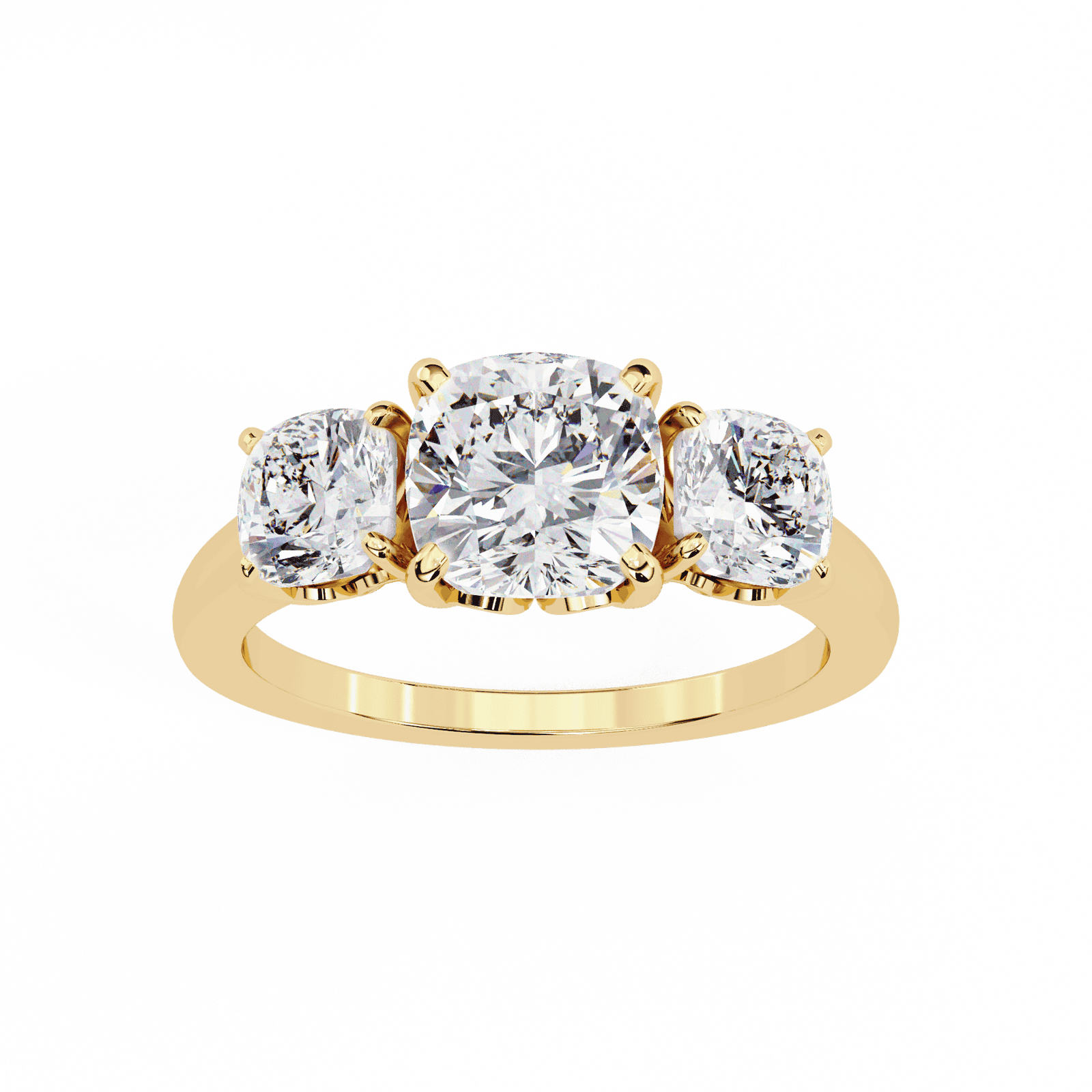 This stunning ring features a cushion-cut center diamond accented by two matching round brilliant side diamonds. The three-stone setting symbolizes the past, present, and future of love, making it a meaningful and timeless choice. Crafted in polished metal with a secure prong setting, this ring exudes brilliance and sophistication.