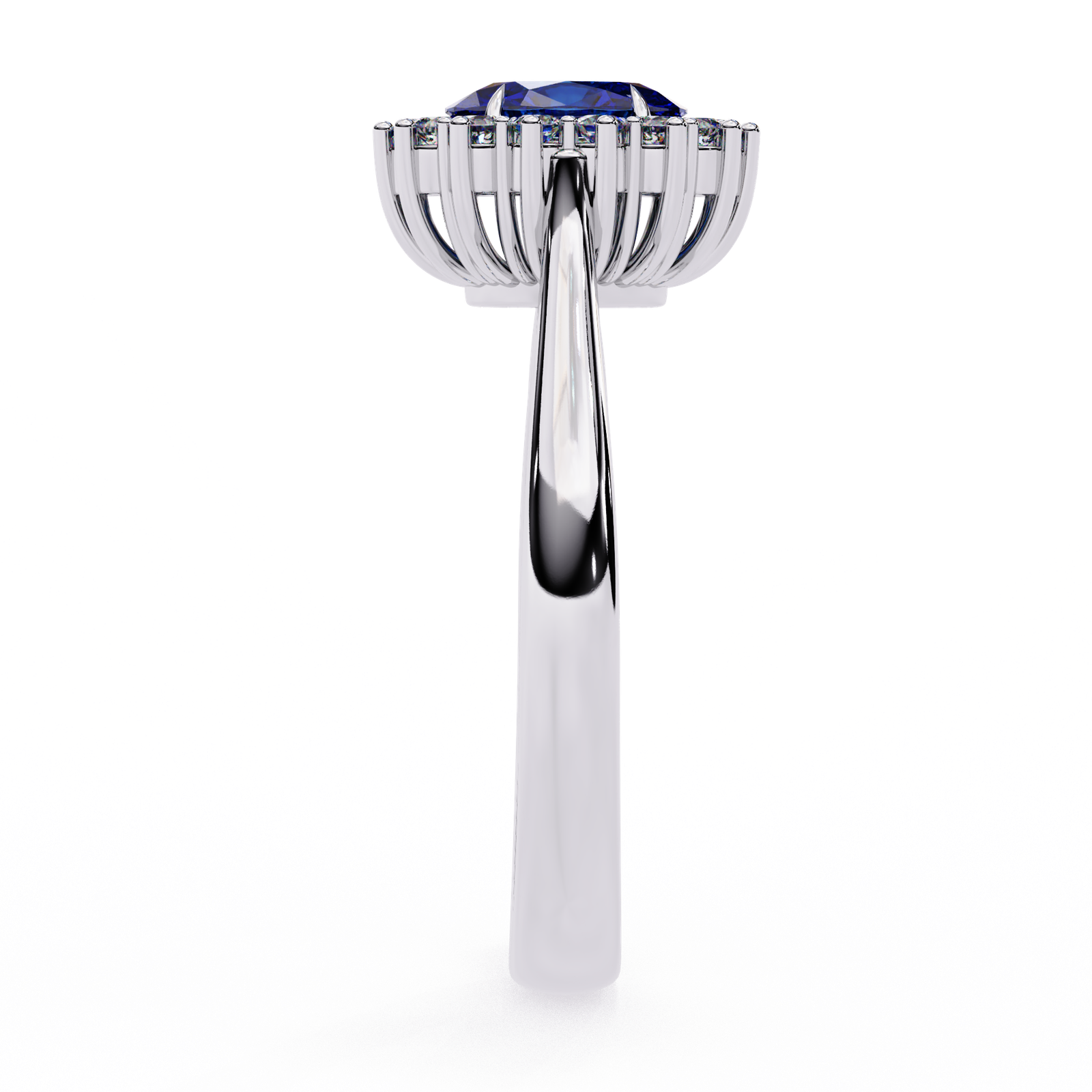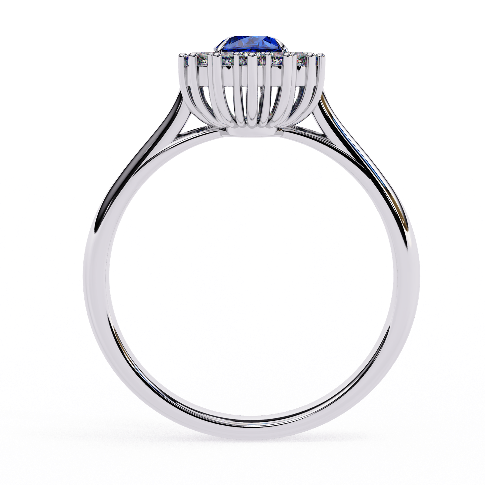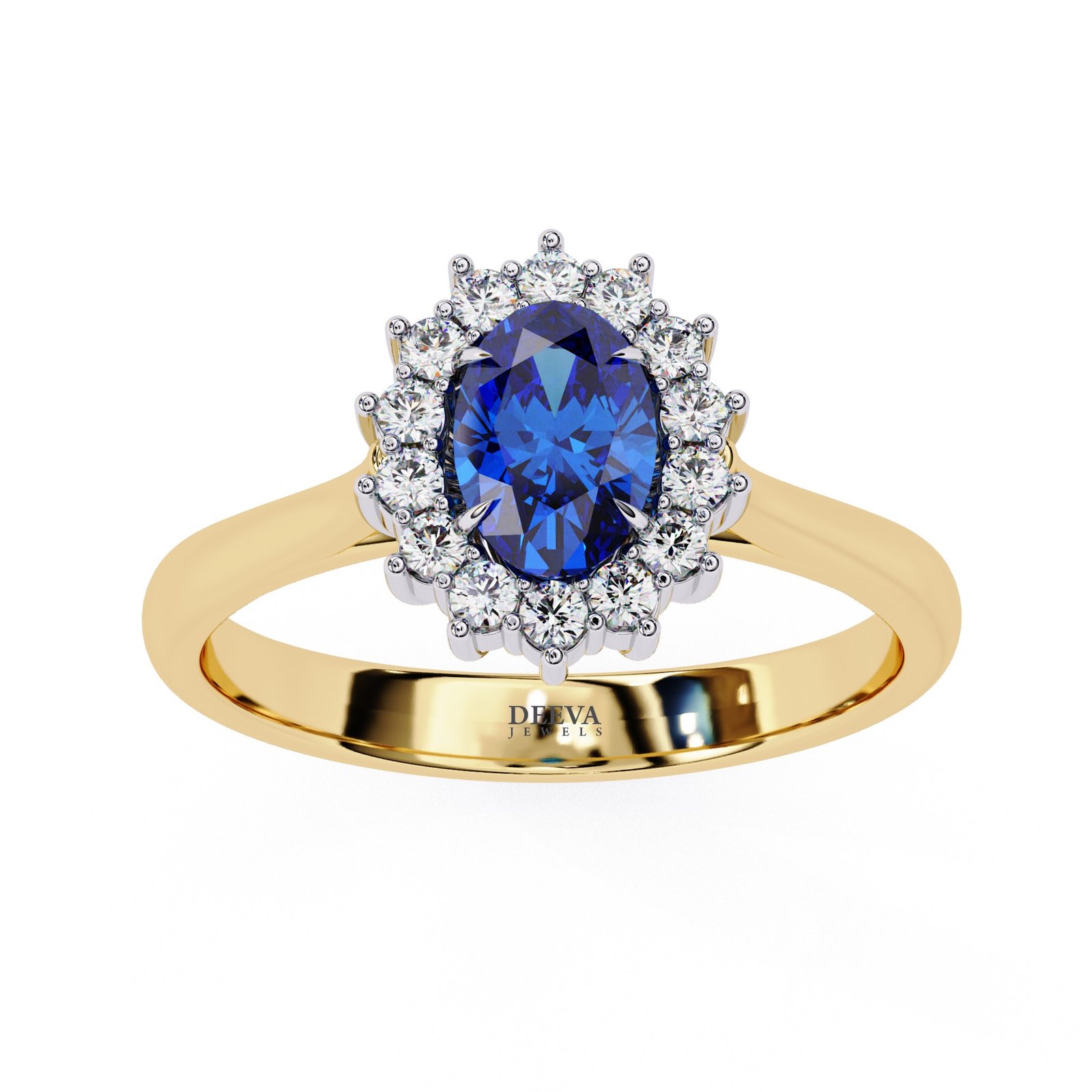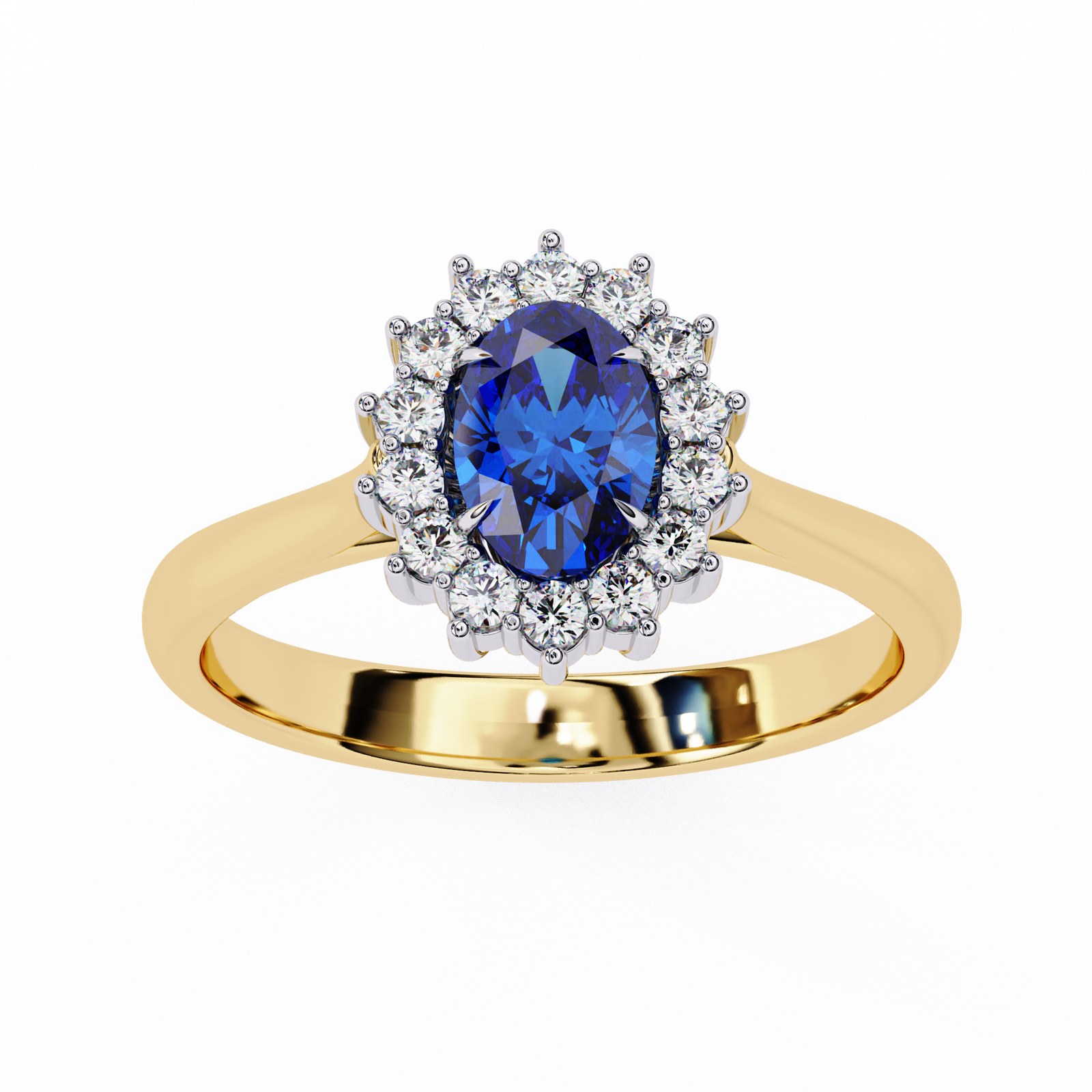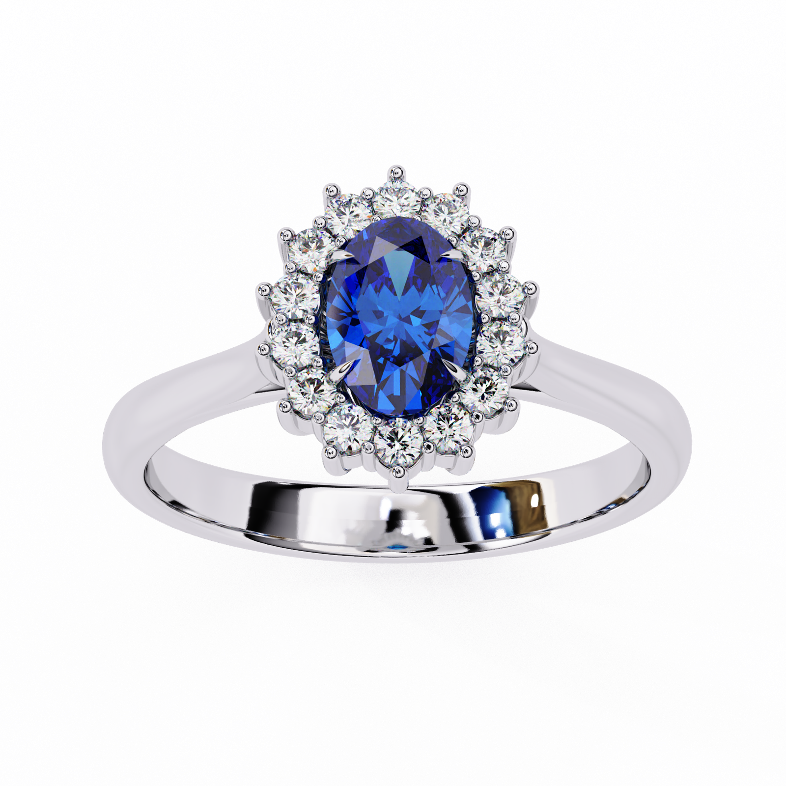 A timeless classic, this ring showcases a deep royal blue oval sapphire at its center, surrounded by a dazzling halo of round brilliant diamonds. The vibrant sapphire radiates sophistication, while the halo enhances its size and sparkle, creating a regal effect. Set on a smooth polished band, this design is a perfect blend of luxury and elegance, making it an ideal engagement ring or statement piece for special occasions.
