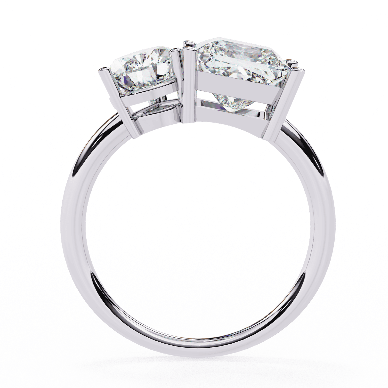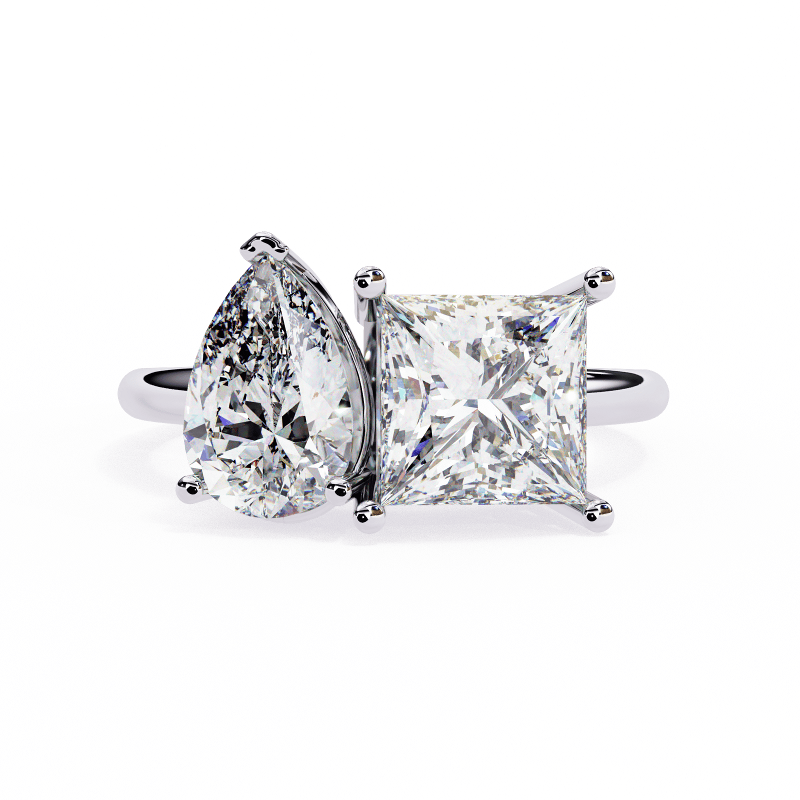 A breathtaking expression of contrast and harmony, this ring features a pear-cut diamond paired beautifully with a princess-cut diamond, set side by side on a sleek band. The pear shape?s soft curves balance the bold, angular brilliance of the princess cut, creating a strikingly modern yet timeless design. Perfect for those who appreciate individuality and elegance, this two-stone ring symbolizes the union of two unique paths into one.
